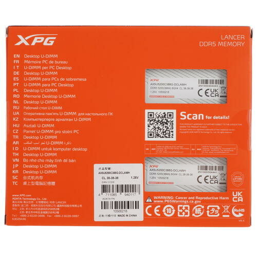 Модуль памяти ADATA 16GB (2 x 8Gb) DDR5 UDIMM XPG LANCER 5200 MHz CL38-38-38 1.25V Белый Радиатор (AX5U5200C388G-DCLAWH)