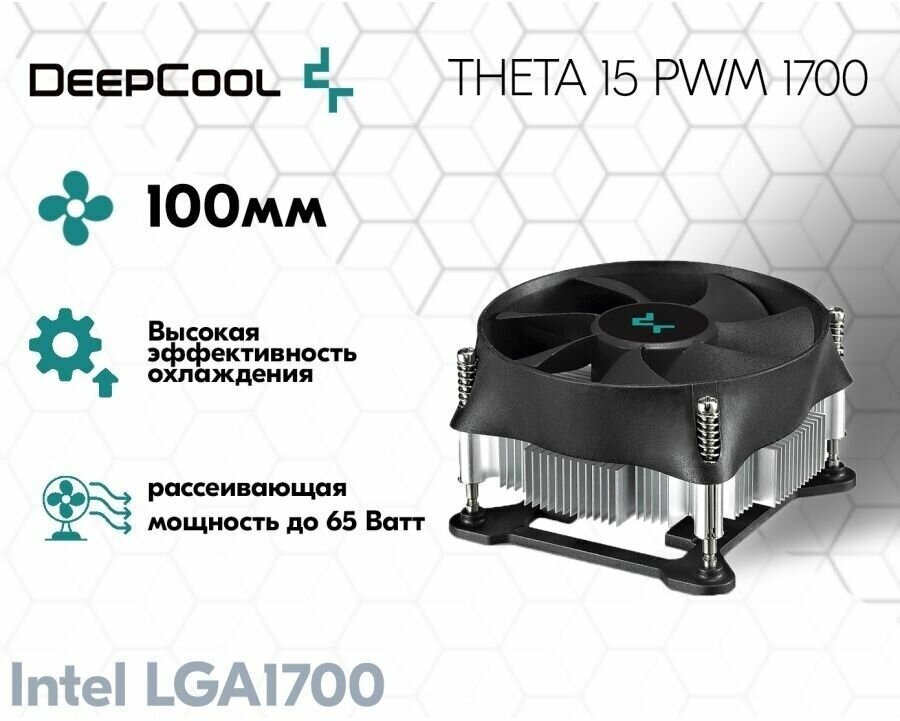 | Краткое название | DEEPCOOL THETA 15 PWM 1700 LGA1700 низкопрофильный 52mm (64шт/кор, TDP 65W, PWM, Fan 100mm, на винтах) Color BOX |