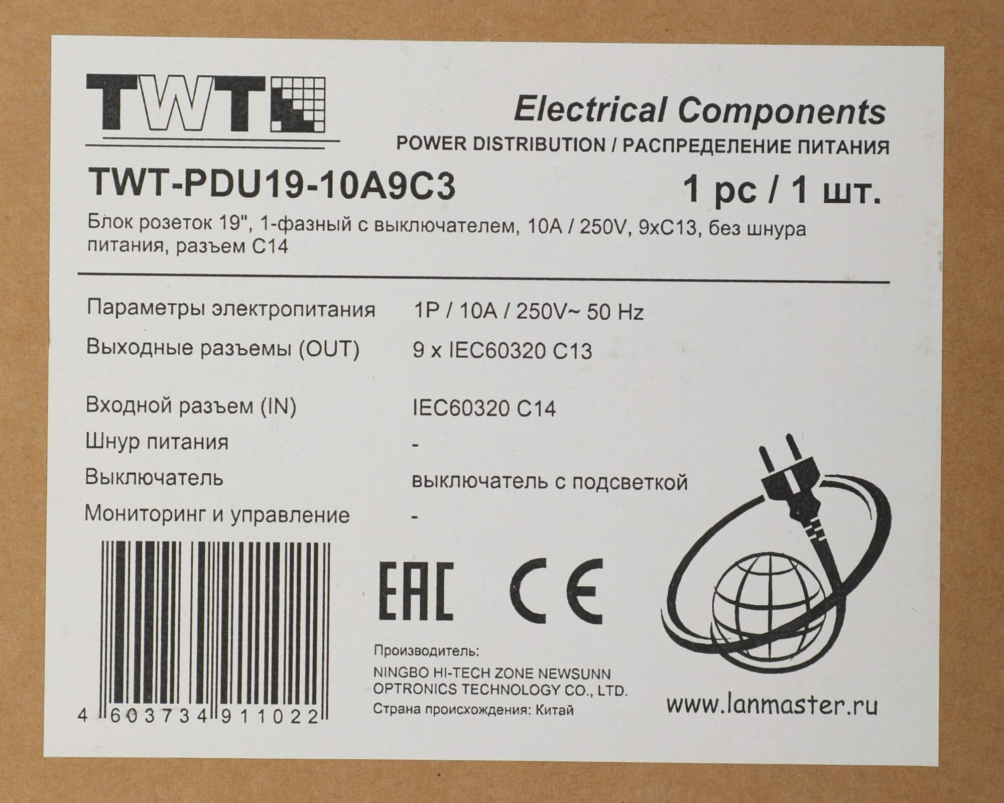 Блок распределения питания Lanmaster TWT-PDU19-10A9C3, горизонтальное размещение, 9xC13, базовые, 10A, без вилки