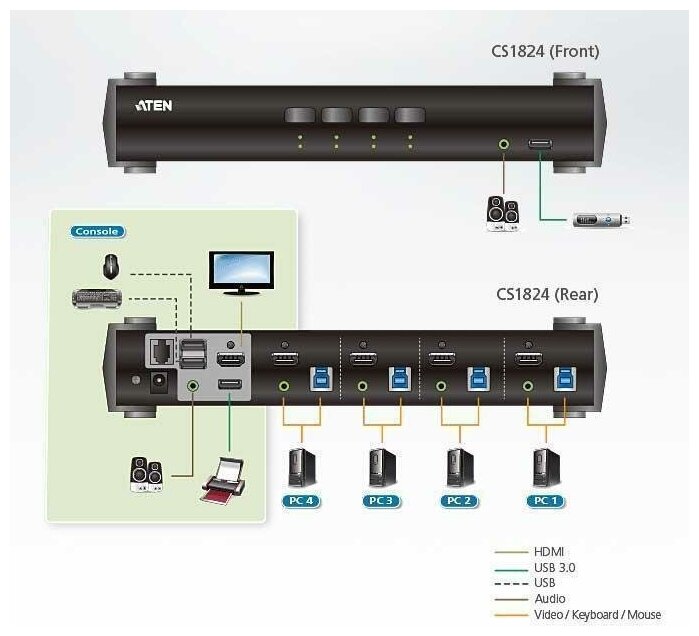 Квм перевключатель ATEN 4-Port USB 3.0 4K HDMI KVMP™ Switch (CS1824-AT-G)