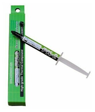 Термопаста Prolimatech PK-1 имеет значительный показатель теплопроводности: он составляет 10.2 Вт/м·К. Это значит, что термопаста способна обеспечить эффективный отвод тепла с поверхности корпуса процессора, который отличается высоким уровнем выделения тепла. Аксессуар подойдет для качественного монтажа процессоров значительной мощности, работающих в экстремальных условиях: например, при высокой температуре воздуха в помещении. Вы сможете эксплуатировать компьютер в интенсивном режиме, не опасаясь перегрева процессора.Термопаста Prolimatech PK-1 упакована в шприц. Этот тип упаковки способствует удобству нанесения изделия. Очень полезным аксессуаром, облегчающим использование термопасты, является шпатель, который есть в комплекте. Конструкция шпателя продумана до мелочей, поэтому справиться с его применением способен даже начинающий пользователь. Масса термопасты составляет 5 г.