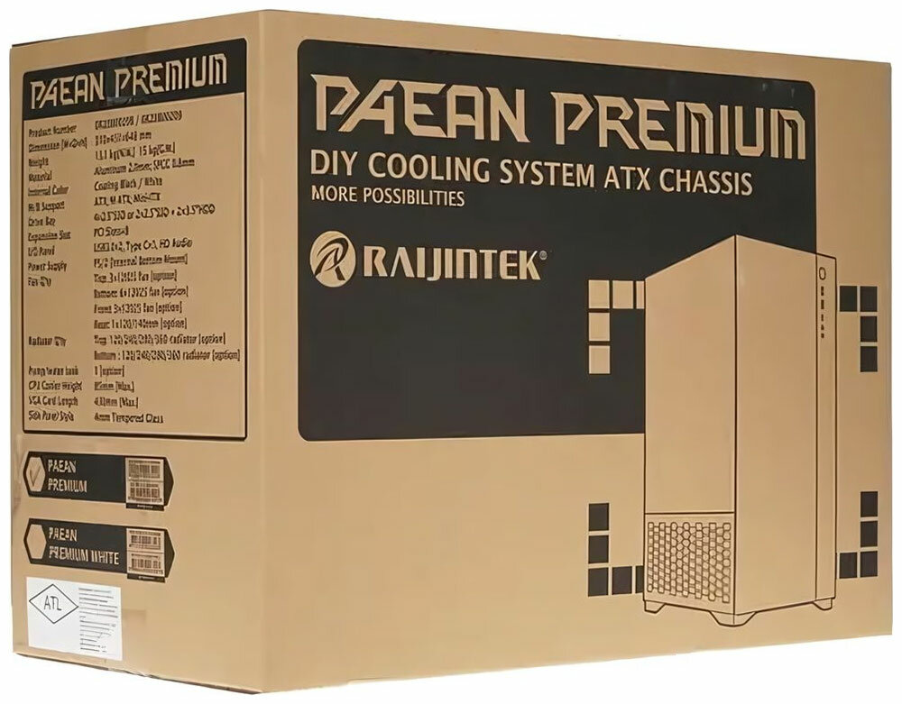 Корпус RAIJINTEK PAEAN PREMIUM [0R20A00208] с дизайном в черном цвете и исполнением «аквариум» с окнами из закаленного стекла отличается значительной площадью вентиляционных отверстий и возможностью установки до 13 вентиляторов. Блок питания устанавливается в отдельный отсек: благодаря этому оптимизируется температурный режим в основном отделении компьютера. БП не входит в комплектацию модели. Вам потребуется источник питания форм-фактора ATX. Корпус RAIJINTEK PAEAN PREMIUM [0R20A00208] соответствует типоразмеру Mid-Tower. Устройство с габаритами 451x310x648 мм рассчитано на сборку мощной игровой системы, графической рабочей станции, производительного универсального ПК или другого компьютера с множеством быстродействующих комплектующих. Модель совместима с материнскими платами 3 форм-факторов – Micro-ATX, Mini-ITX и Standard-ATX. Максимальная длина совместимых видеоадаптеров 430 мм актуальна для любителей ресурсоемких видеоигр. Высота кулера процессора ограничена 170 мм. Допускается установка системы жидкостного охлаждения с монтажным размером радиатора до 360 мм.