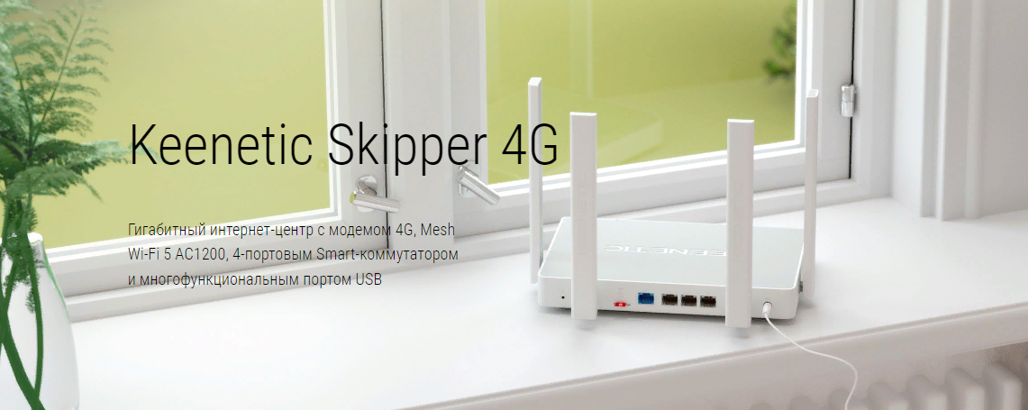 Keenetic Skipper 4G (KN-2910) Гигабитный интернет-центр с модемом 4G Mesh Wi-Fi 5 AС1200 4-портовым Smart-коммутатором и многофункциональным портом USB