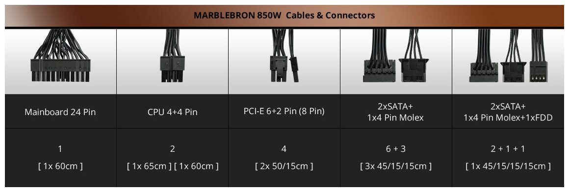 Блок питания Enermax MarbleBron 850W [EMB850EWT] сертифицирован по стандарту 80 PLUS Bronze, то есть заявленная эффективность достигает 88% при нагрузке в 50%. Номинальная мощность модели составляет 850 Вт, что дает возможность обеспечивать энергией компьютеры с высокопроизводительной видеокартой или с профессиональными конфигурациями. Модель оснащена основным разъемом питания 24 pin, двумя портами для процессора 4+4 pin и четырьмя для видеокарты 6+2 pin. Кроме того, присутствует разъем 4-pin Floppy, предназначенный для питания дисководов. Блок питания Enermax MarbleBron 650W [EMB850EWT] оснащен активной системой охлаждения, которая предусматривает постоянную работу вентилятора Smart Airflow Control, обороты которого регулируются автоматически. Это позволяет избежать перегрева для стабильной работы компьютера.