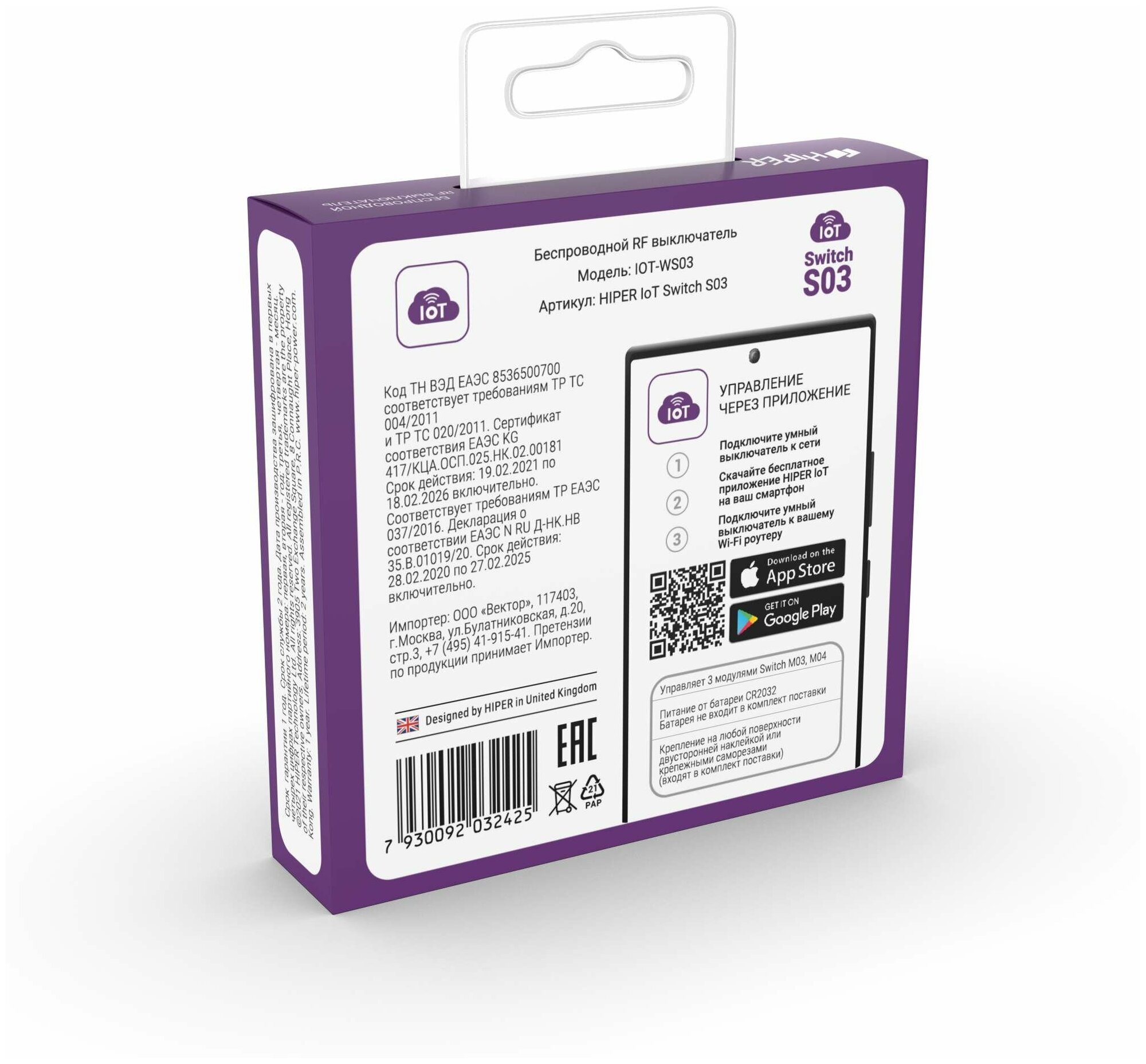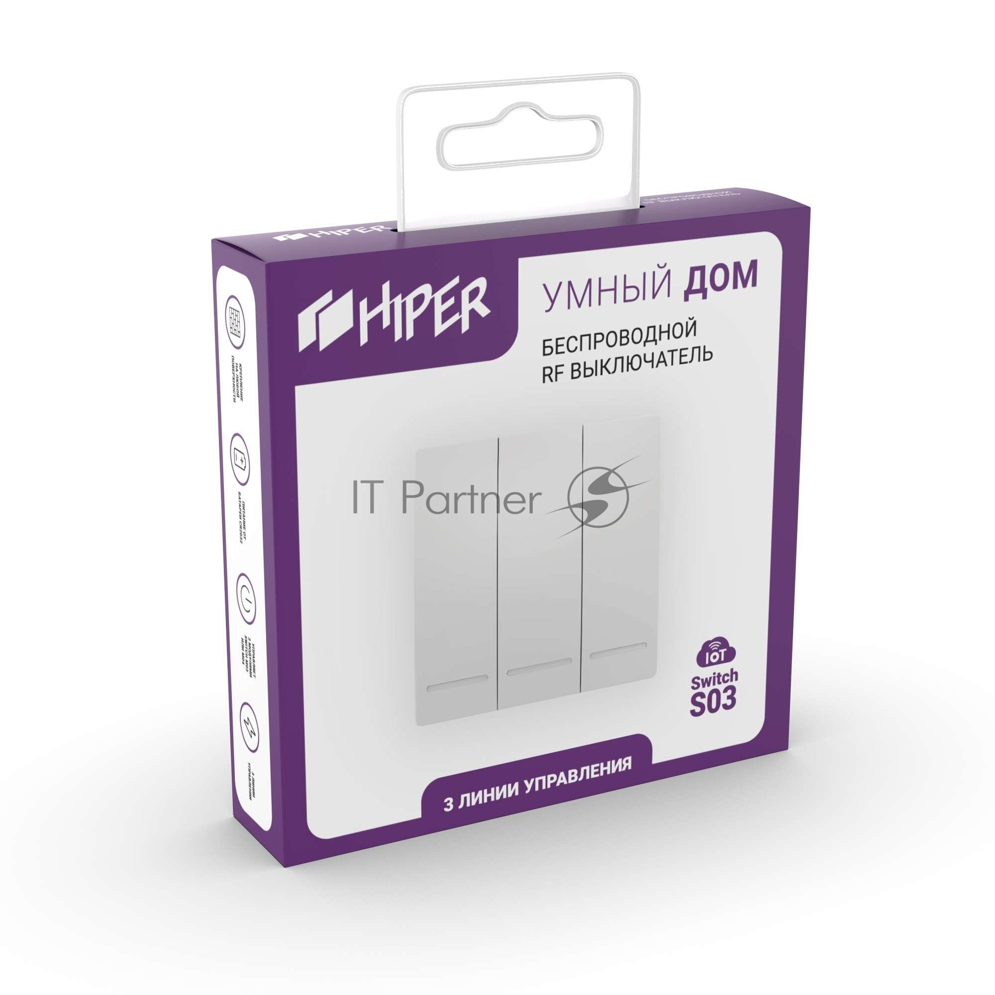 HIPER IoT Switch S03 – это беспроводной RF выключатель, предназначенный для управления 3 умными Wi-Fi модулями Switch M03, Switch M04.