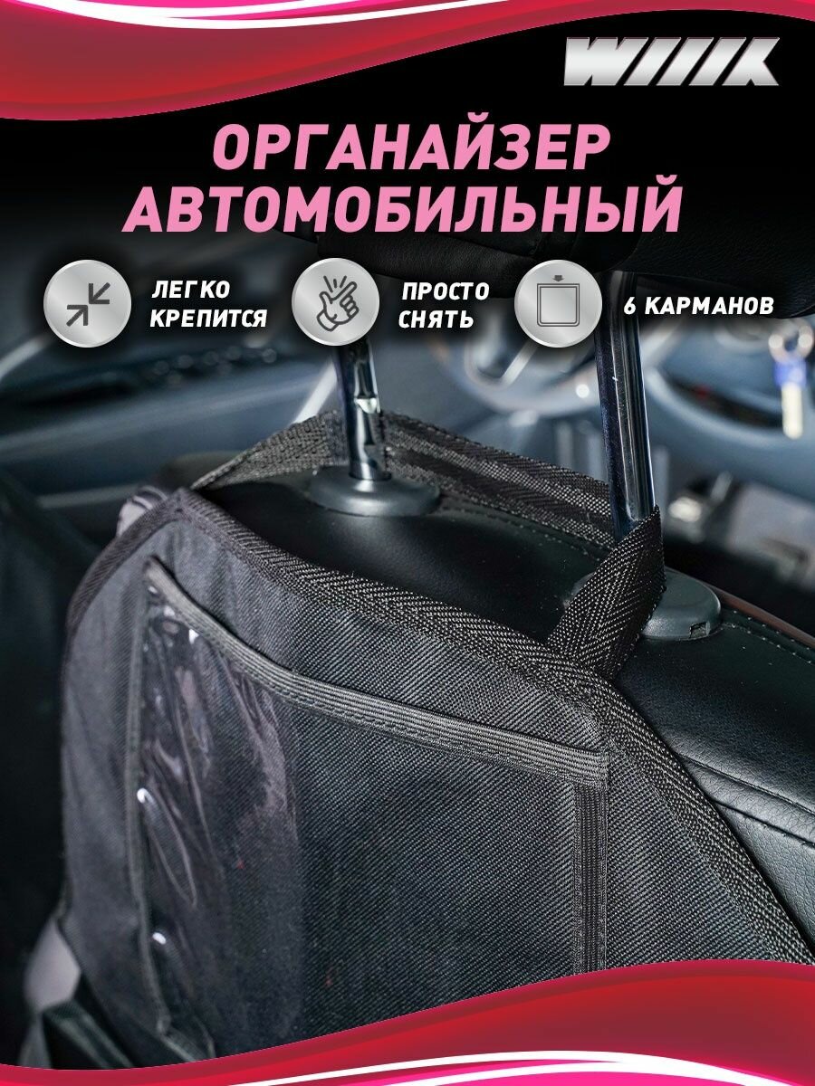 Органайзер на спинку сиденья в авто, размером 700х500 мм (ВхШ) - отличное решение для родителей, часто путешествующих с детьми в автомобиле. Отдельный карман с тачскрином для планшета и с вырезом для зарядки - способно сделать дальнюю дорогу или путешествие не таким утомительным и скучным для детей и взрослых, который с удовольствием займется просмотром детских фильмов или развлекательных программ. Шесть функциональных карманов позволят разместить в салоне автомобиля все необходимые детские принадлежности или вещи которые очень нужны в машине. Усиленный каркас накидки на сидения машины обеспечивает органайзеру фиксированное положение, вставка из пластика помогает органайзеру не сминаться и держать свою форму при полной загрузки чехла вещами. Органайзер для хранения вещей, документов выполнен из прочной ткани - Оксфорд 600. Органайзер для путешествий послужить вам как держатель для вещей, накидка на сидения от грязных ног, или как детский универсальный чехол.