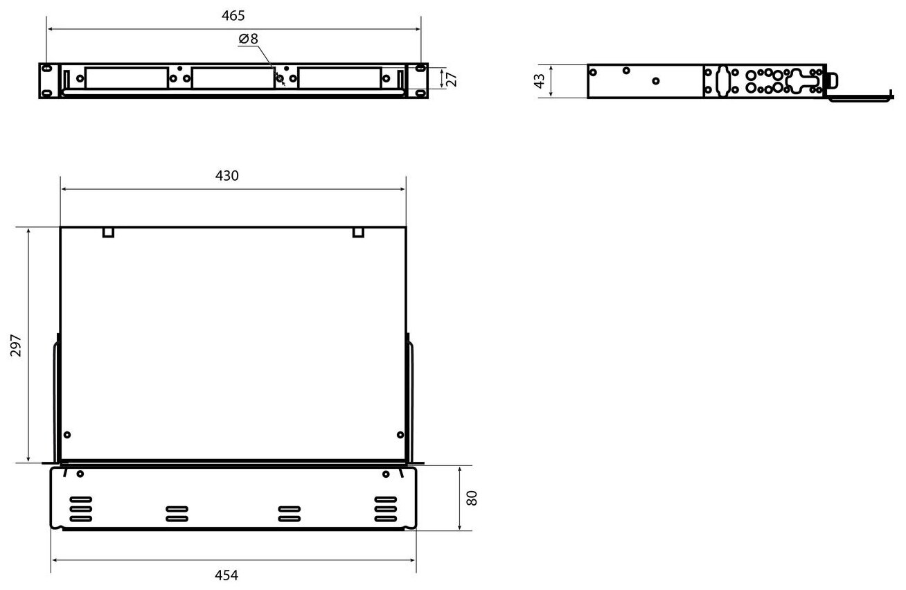 | Комплектация | корпус, сплайс кассета, крышка сплайс-кассеты, сменная планка (панель) 8 FC/ST 3 шт., сменная планка (панель) 8 SC/DLC 3 шт., панель-заглушка 2 шт., фиксатор панели 6 шт., уголки для установки в 19" конструктивы (с крепежом) 2 шт. |