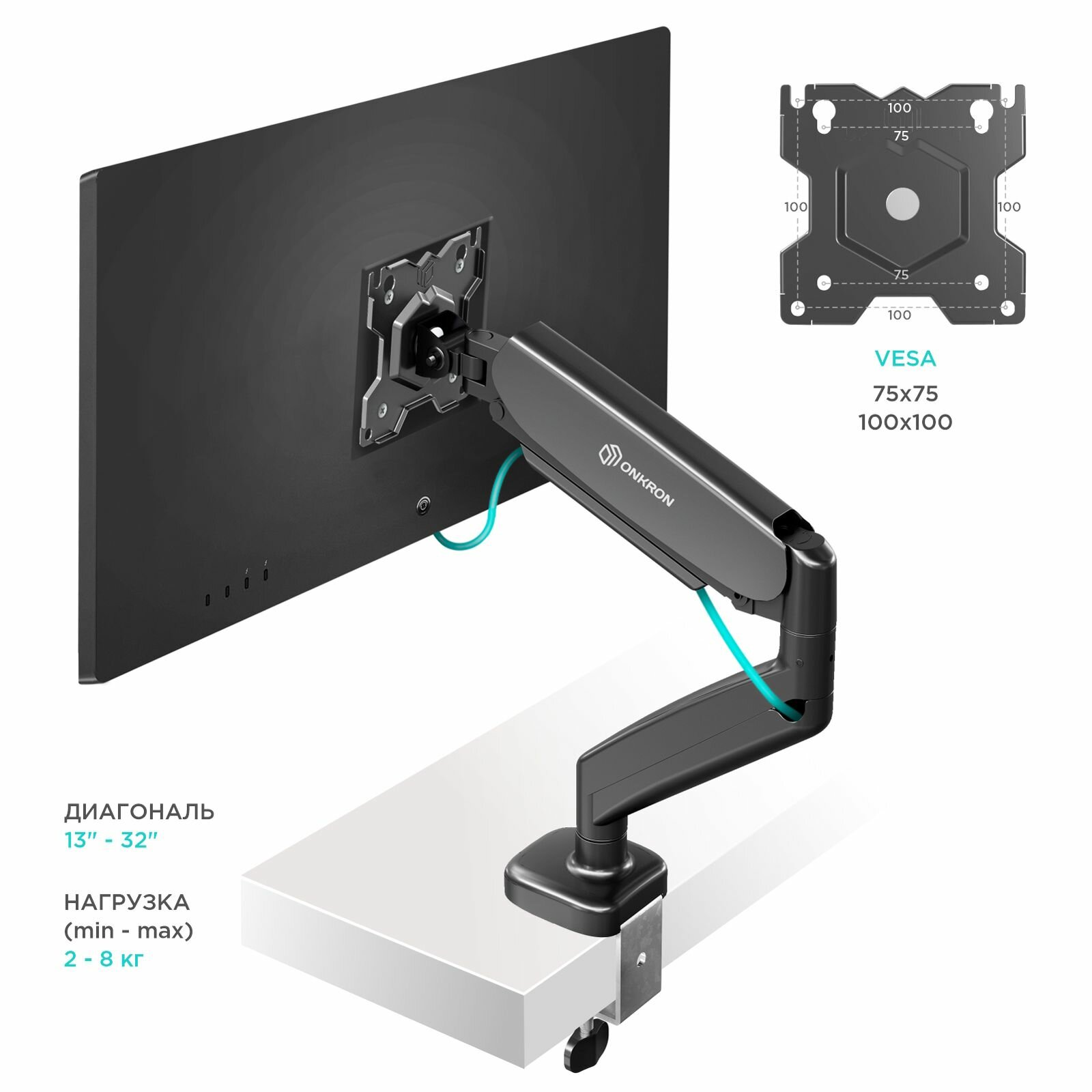 G50 — востребованный настольный кронштейн для одного монитора. Он подходит для большинства компьютерных мониторов весом до 8 кг с диагональю от 13 до 32 дюймов, под самые распространенные крепления стандарта VESA 75х75 мм и 100х100 мм.