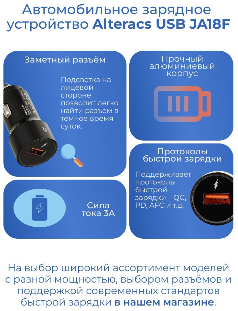 Автомобильное зарядное устройство для телефона и гаджетов поддерживает протоколы быстрой зарядки AlterАcs JA18F. Автомобильная зарядка USB подключается к адаптеру постоянного тока и применима ко всем устройствам с USB-питанием, таким как iPhone, Android-телефоны, iPad, планшеты, банки питания, MP3, MP4-плееры, GPS, камеры, PSP в вашей машине. Маленький алюминиевый корпус черного цвета совершенно не заметен и надежно держится в прикуривателе. А неяркая подсветка на лицевой стороне позволит легко найти USB-разъем в темное время суток. Автомобильное ЗУ имеет один разъем USB Type-A, который поддерживает протоколы быстрой зарядки – QC, PD, AFC и т.д. Максимальная мощность зарядки 18 Вт.