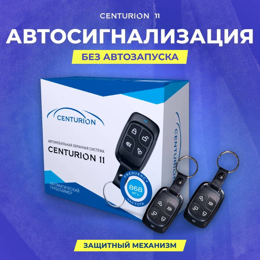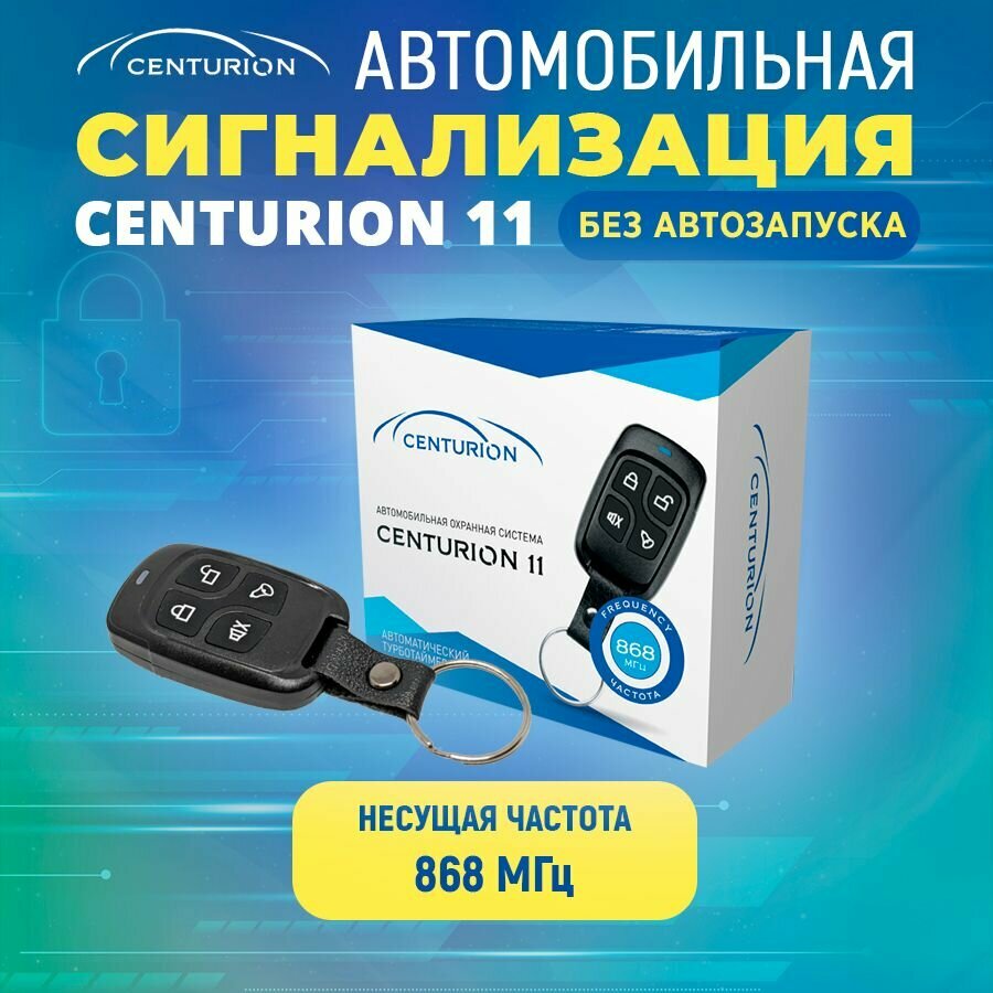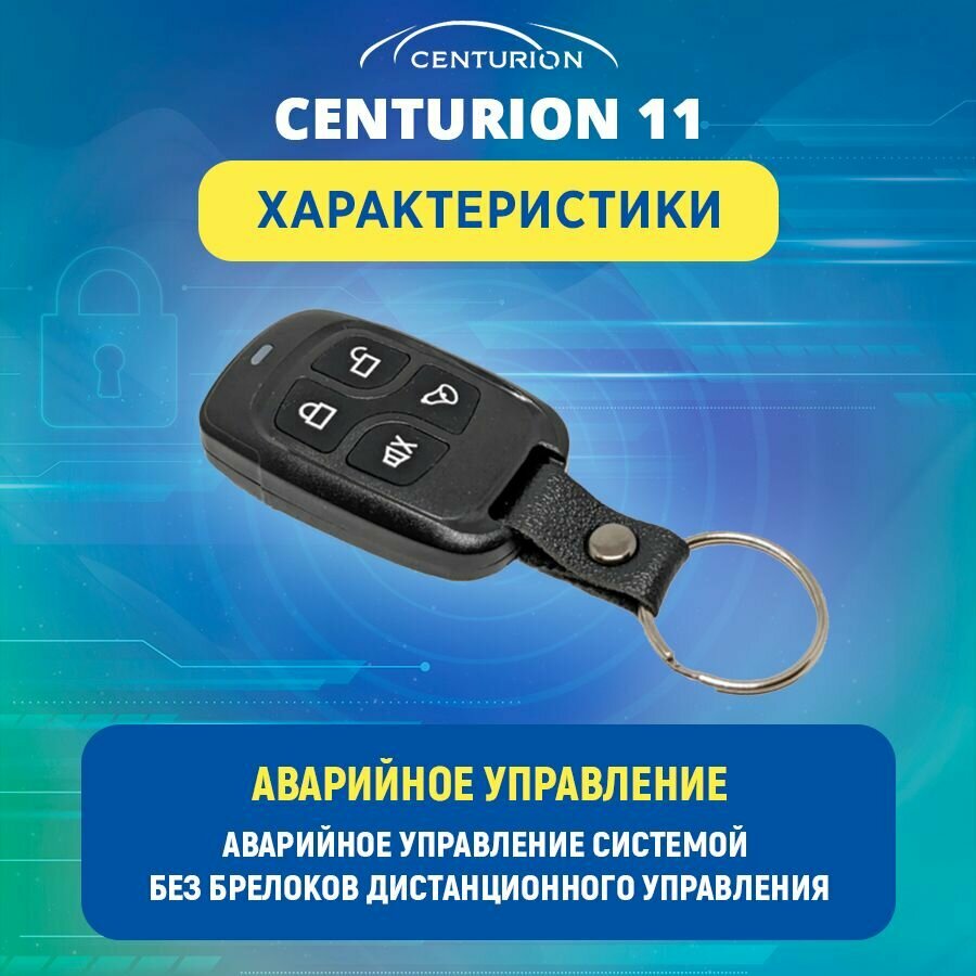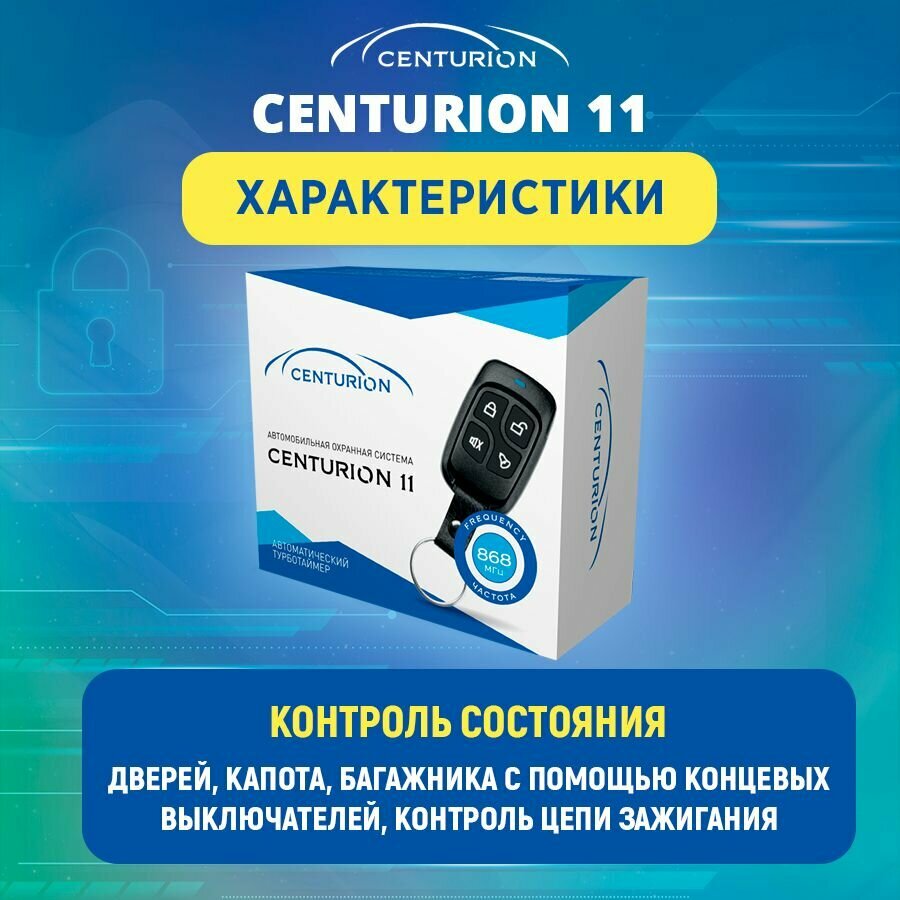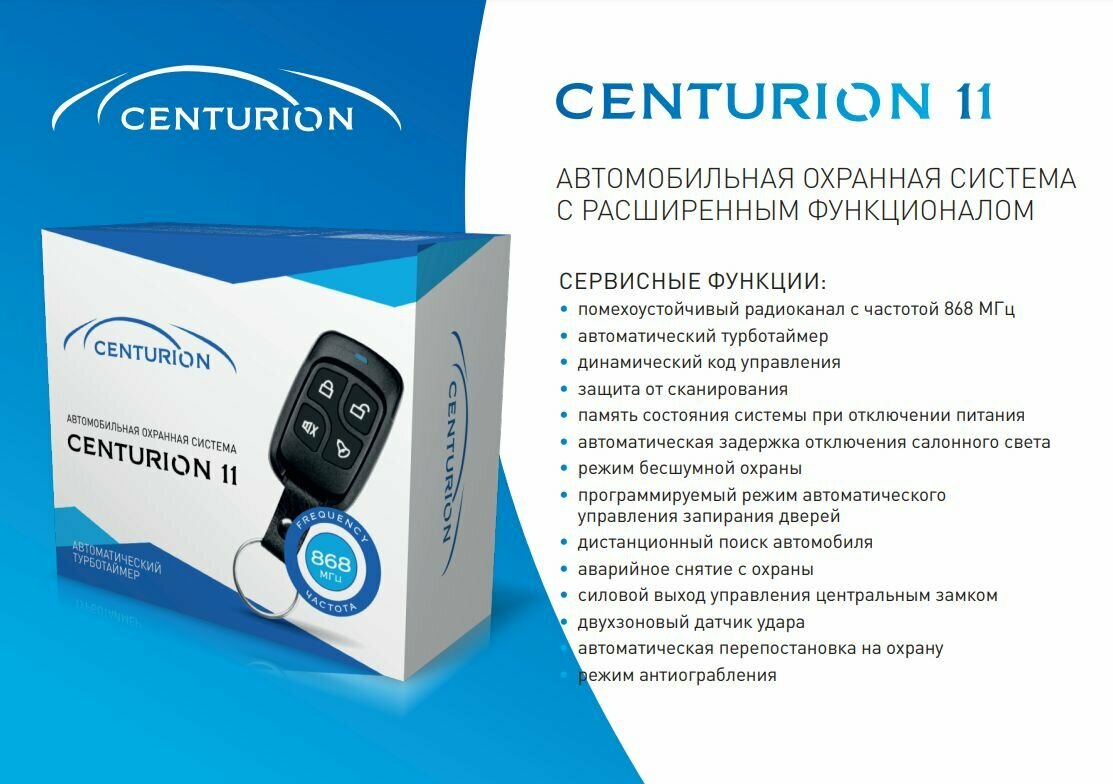 Особенностью Centurion 11 является радиоканал. Динамический код передается на частоте 868 МГц, тип модуляции радиосигнала FSK. Пользователь увидит эффект использования частоты 868 МГц в увеличенной дальности управления, более стабильной связью между брелоком и центральным блоком автомобиля. Кроме того, использование частоты 868 МГц позволяет существенно повысить угоностойкость системы. Особенности Centurion 11 не ограничиваются частотой радиоканала. В этой системе реализована функция турботаймера. Автопостановка на охрану, антиограбление, тихая охрана, Бесшумное включение режима охраны, Бесшумный режим охраны, Режим Anti-HiJack
