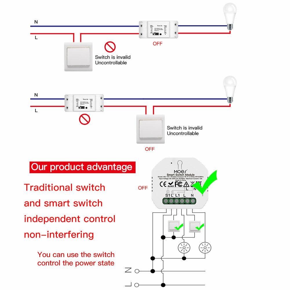 Этот умный модуль Wi-Fi с мини-дизайном подходит для настенного переключателя US и легко скрывает его в скрытой настенной коробке переключателя традиционного переключателя, не влияя на ваш оригинальный стиль украшения, чтобы сделать его умным, давая вашим устройствам максимальную мощность / выключить интеллектуальный макияж и преобразовать большинство любых совместимых продуктов в интеллектуальные. (Примечание: этот модуль подходит только для кулисного переключателя) Может использоваться как однополюсная или трехходовая цепь (2 переключателя управляют 1 светом); просто подключитесь к 1 из 2 переключателей и преобразуйте подключенное устройство в интеллектуальное (для 3-ходовой схемы) Позволяет использовать голосовую связь без помощи рук и беспроводной пульт дистанционного управления; совместим с Alexa и Google Home; удаленно управлять устройствами с помощью смартфона, где бы вы ни находились, даже когда вы находитесь вдали от дома