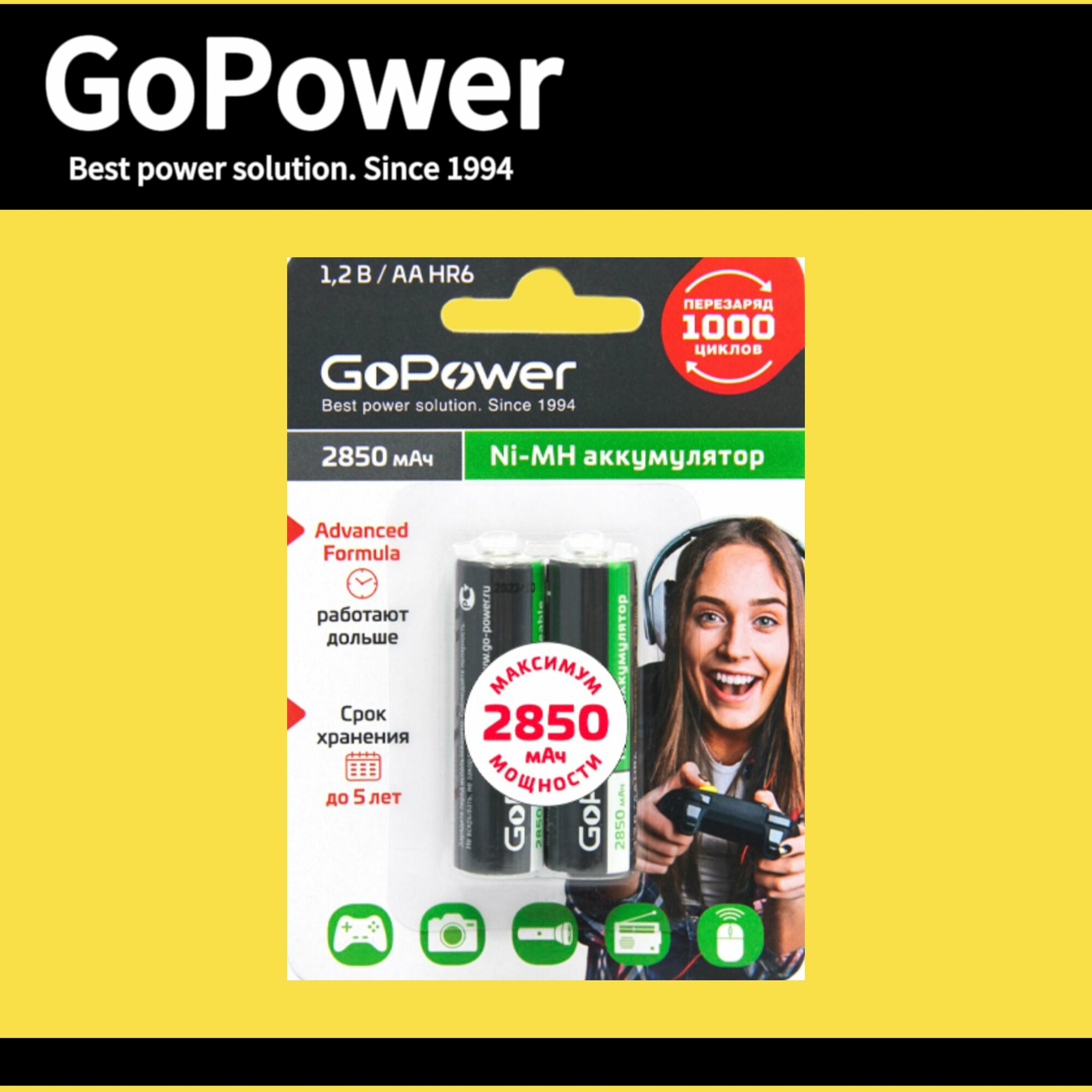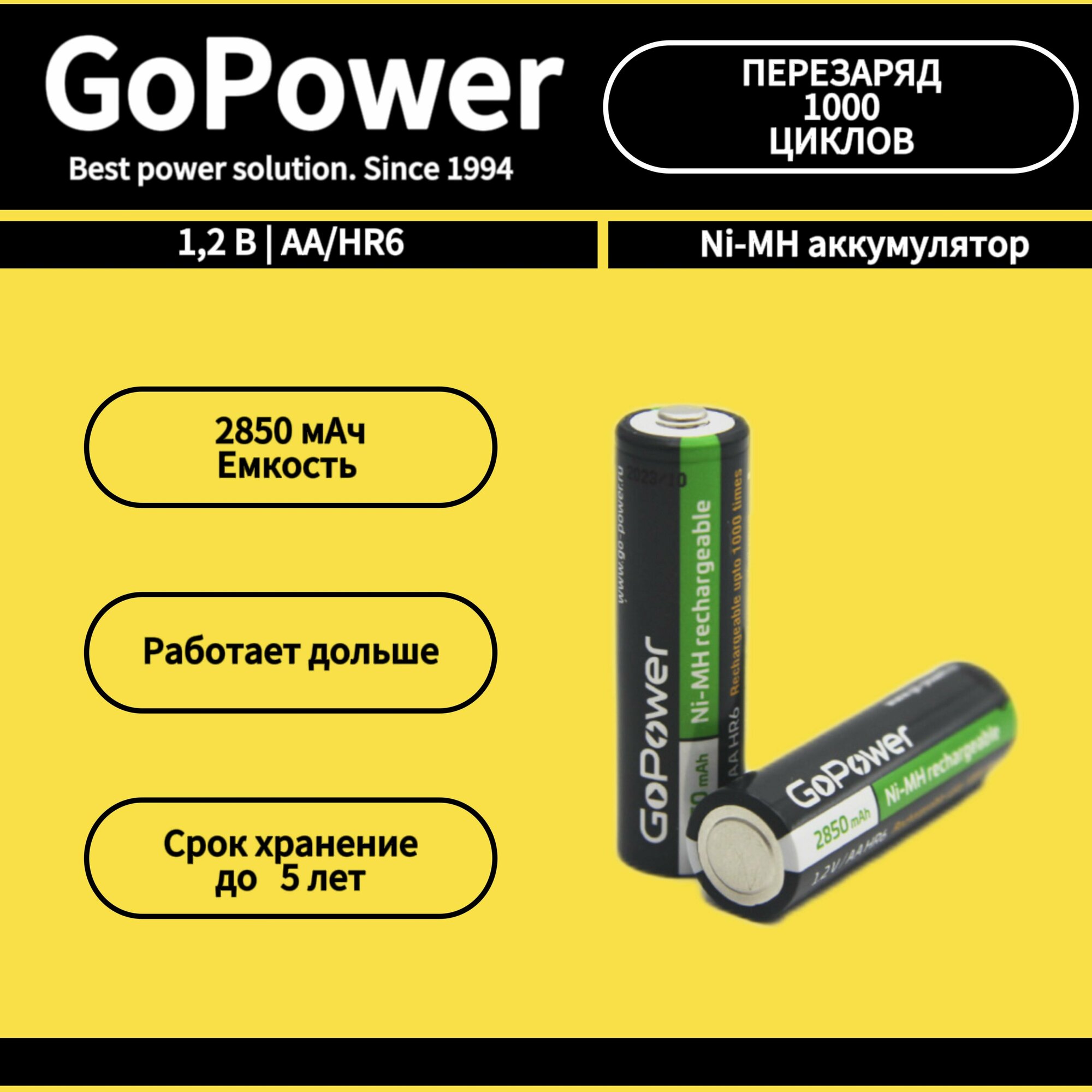 Цена указана за упаковку. Упаковка 2 штукиNi-MH аккумулятор размера ААА/НR6 емкостью 2850мАч. Если вы часто покупаете батарейки, переходите на Ni-MH аккумуляторы GoPower! Ni-MH аккумуляторы GoPower перезаряжаемы до 1000 раз и заменят батарейки во всех современных устройствах, они сэкономят деньги и не навредят окружающей среде. Производятся по улучшенной технологии с использованием премиальных компонентов, что гарантирует продолжительный срок службы 1000 циклов и сниженный саморазряд.