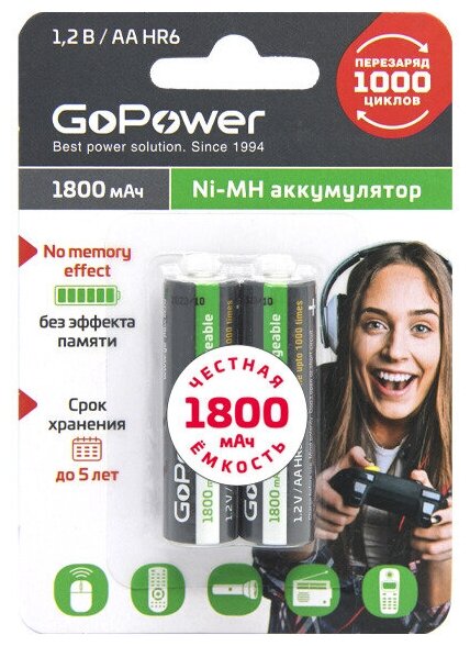 Аккумулятор бытовой GoPower HR6 AA BL2 NI-MH 1800mAh (2/20/240) блистер (2 шт.) Аккумулятор бытовой GoPower HR6 AA (00-00015317)