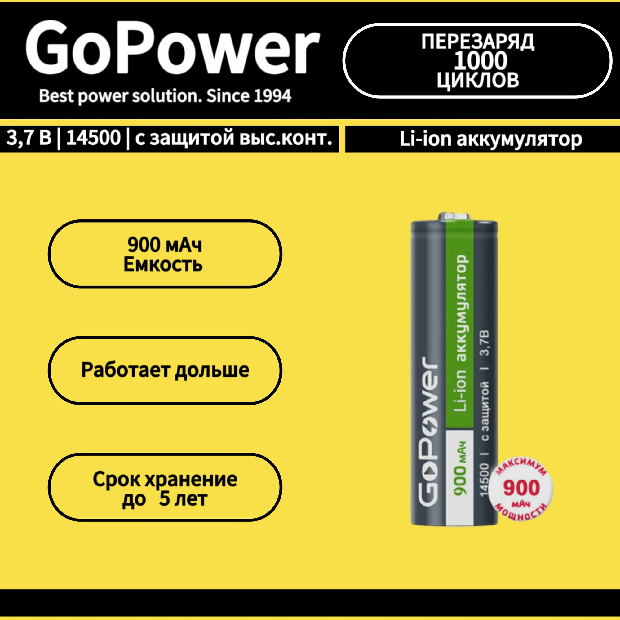 | Наименование модели | Аккумулятор Li-ion GoPower 14500 AA BL1 3.7V 900mAh с защитой выс.конт. |