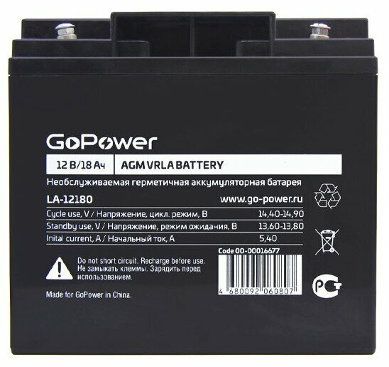 Аккумулятор свинцово-кислотный GoPower LA-12180 12V 18AhСвинцово-кислотные аккумуляторные батареи GoPower LA-12180 12V 18Ah полностью герметизированные, необслуживаемые, с системой рекомбинации газов (VRLA). Свинцово-кислотный аккумулятор GoPower производится по технологии AGM - электролит абсорбирован в стекловолоконном сепараторе, что обеспечивает абсолютную защищенность от утечки электролита. Аккумуляторные батареи GoPower отличаются широким диапазоном рабочих температур от - 20 С до +50 С и минимальным саморазрядом не более 2,5 % в месяц при нормальных условиях. Аккумуляторы соответствуют международным стандартам безопасности и рекомендованы для применения в охранно-пожарных системах, системах контроля и управления доступом, источниках бесперебойного питания (ИБП), телекоммуникационном оборудовании, осветительном оборудовании, детских электромашинах и других областях. Области применения: системы бесперебойного питания, резервного энергоснабжения, автономные энергосистемы.