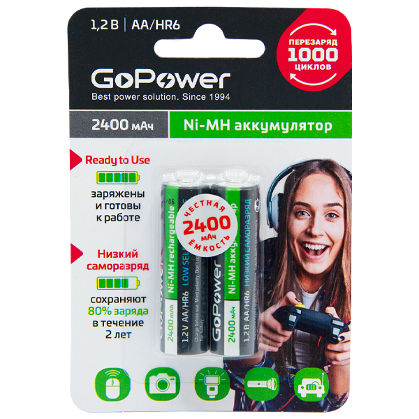 00-00018320 Ready-to-Use Аккумулятор предзаряженный AA/HR6 Ni-MH, 2400мАч, 2шт, GoPower Ni-MH аккумулятор размера АА/НR6 емкостью 2400мАч. Ni-MH аккумуляторы GoPower с низким саморазрядом перезаряжаемы до 1000 раз и заменяют батарейки во всех современных устройствах. Изготовлены по технологии Ready-to-Use с использованием премиальных компонентов, поэтому поставляются уже заряженными и готовы к использованию сразу после покупки. Сохраняют до 80% заряда в течение не менее 2 лет хранения. "Честная емкость" - действительное соответствие указанной емкости. Без "эффекта памяти". Подходят для быстрого заряда. Широкий диапазон рабочих температур от - 20°С до +50°С. Срок хранения до 5 лет. Области применения: Идеальны для мощных устройств: беспроводные мыши, радио, фонари, игровые консоли, фотоаппараты, детские игрушки, бесконтактные термометры. Тип: Ni-MH Номинальная емкость: 2400 mAh Номинальное напряжение (V): 1,2 V Типоразмер: AA / HR6 Упаковка: блистер 2 шт.