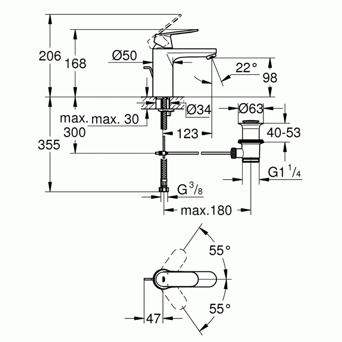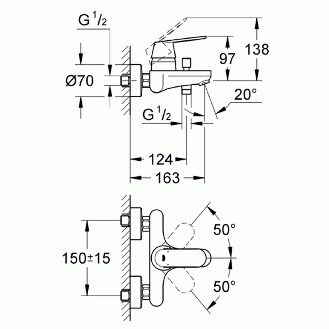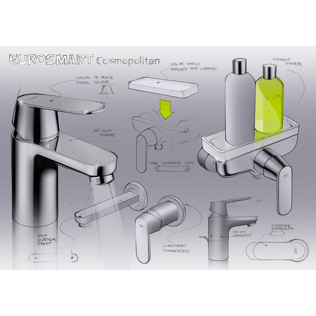 - GROHE QuickFix (регулируемое расстояние между настенными креплениями штанги позволяет использовать для монтажа уже имеющиеся отверстия в стене)