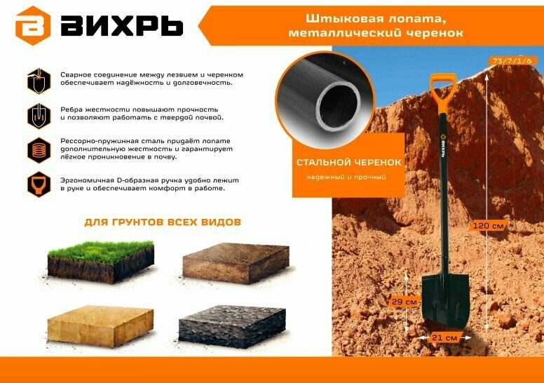 Штыковая лопата Вихрь металлический черенок 73/7/1/6 - многофункциональный инструмент для выполнения целого ряда задач. Предназначена для грунтов всех видов. Сварное соединение между лезвием и черенком обеспечивает надёжность и долговечность. Рёбра жесткости повышают прочность и позволяют работать с твёрдой почвой. Рессорно-пружинная сталь придаёт лопате дополнительную жёсткость и гарантирует лёгкое проникновение в почву. Эргономичная D-образная ручка удобно лежит в руке и обеспечивает комфорт в работе.