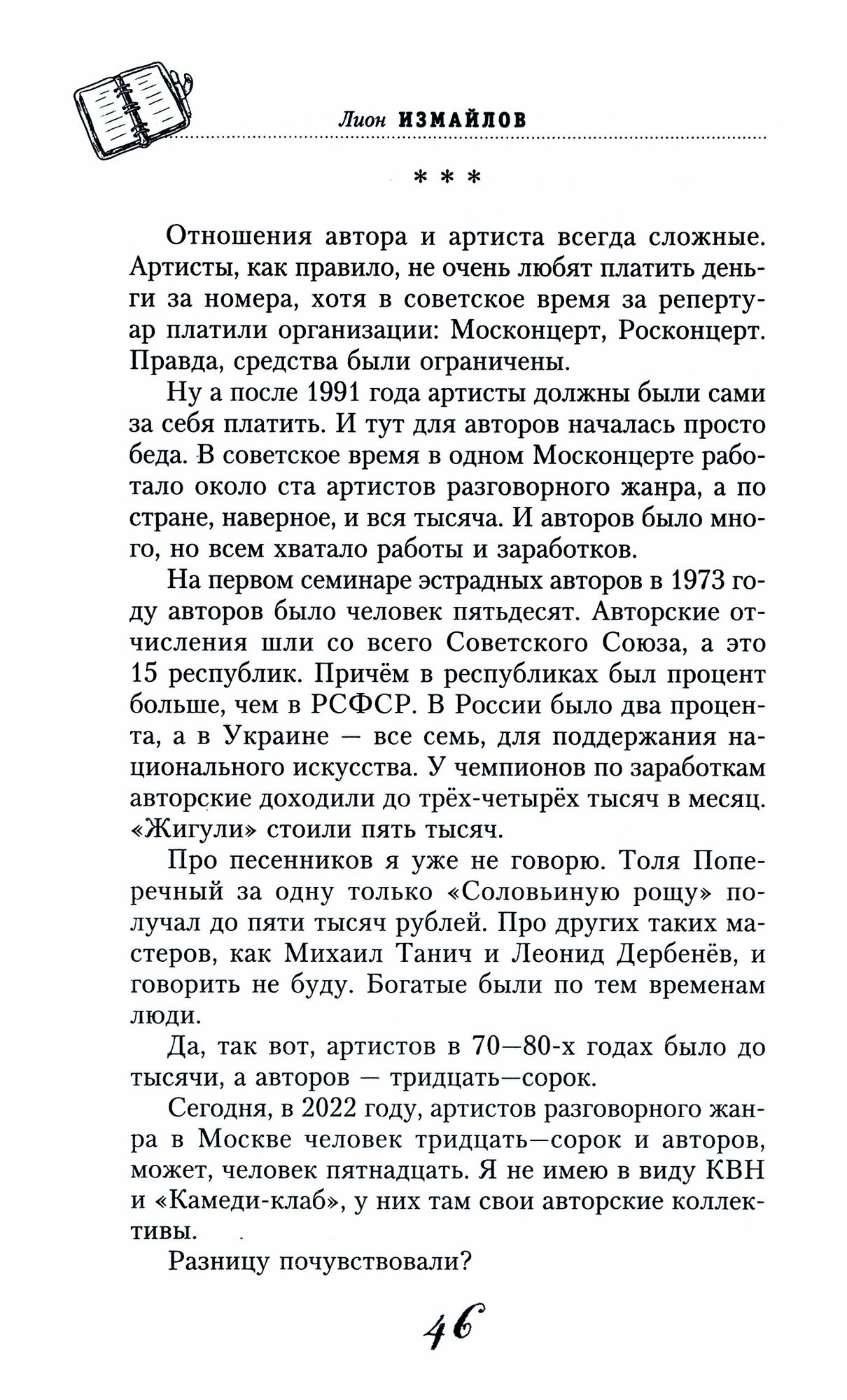 Лион Моисеевич Измайлов - прекрасный рассказчик, и это качество не изменяет ему и когда он делится историями о коллегах по цеху. Каждая описанная им личность уникальна и поэтому обросла байками, анекдотами и просто смешными случаями. Их-то Лион Моисеевич, часто - непосредственный участник событий, и описывает в своей непревзойдённой манере. Не обойдены вниманием Михаил Задорнов, Геннадий Хазанов, Аркадий Райкин, Аркадий Хайт и Аркадий Курляндский, Михаил Жванецкий, Аркадий Арканов, Анатолий Трушкин, Роман Карцев, Михаил Танич, Леонид Дербенёв и другие юмористы. Упомянуты и непростые отношения автора и артиста. А на десерт - весёлые записки разных лет с юмором на любой вкус.