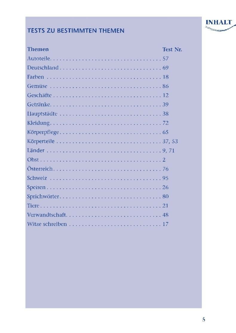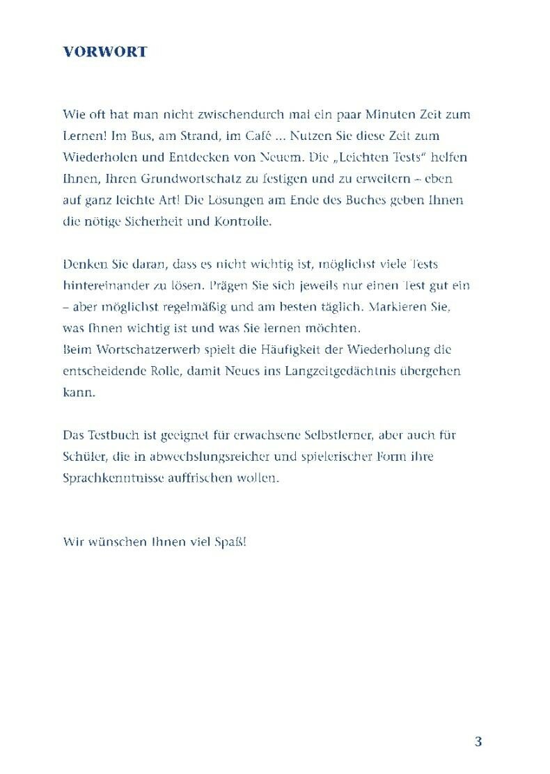 Die Tests mit Losungsschlussel geben dem Sprachenlerner mehr Sicherheit im mundlichen und schriftlichen Ausdruck. Auf spielerische Art und ohne Anstrengung lassen sich wichtige Worter zu ganz verschiedenen Themengebieten wiederholen oder neu erlernen.