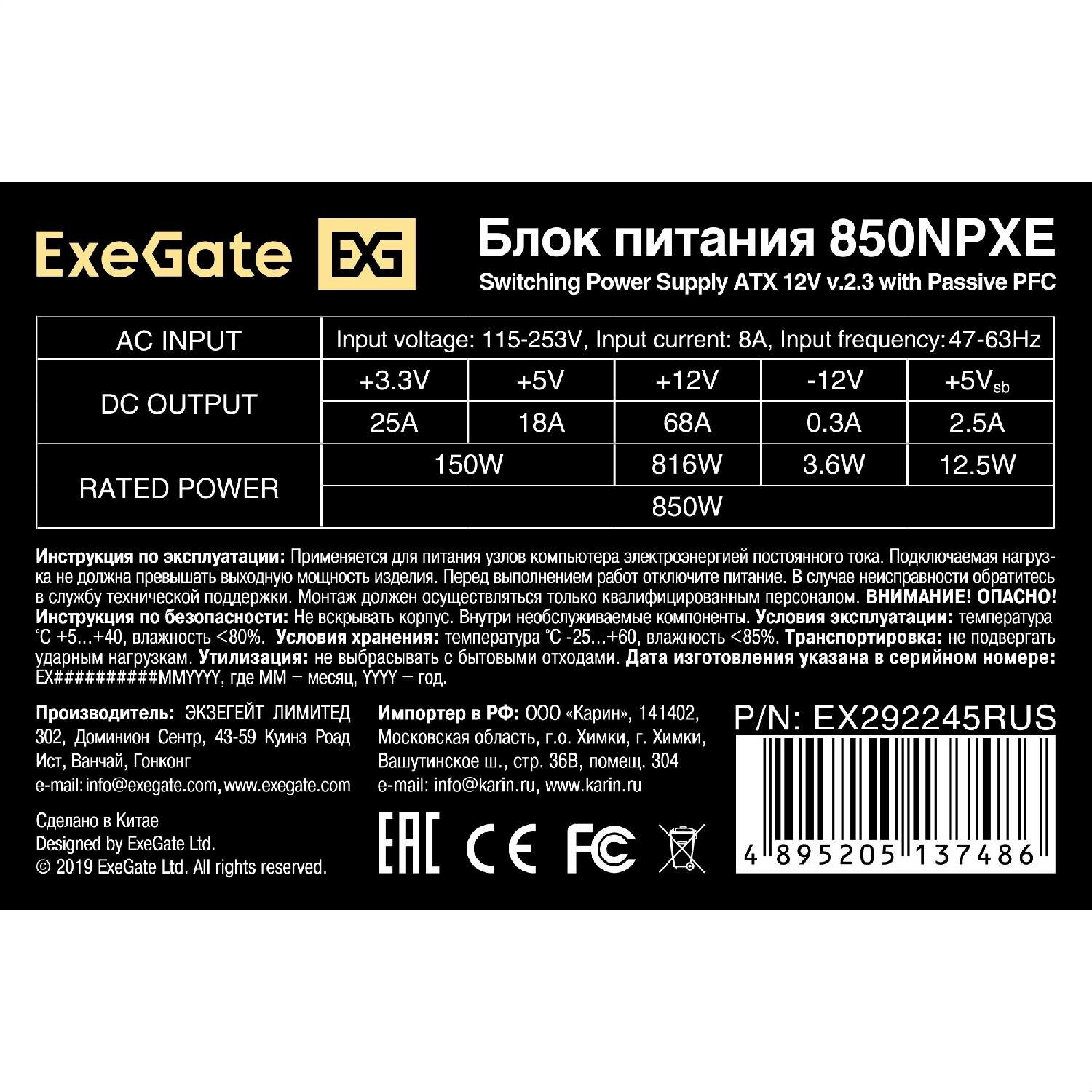 Блок питания ATX Exegate EX292245RUS-PC 850W 120mm fan black кабель 220V в комплекте 850NPXE