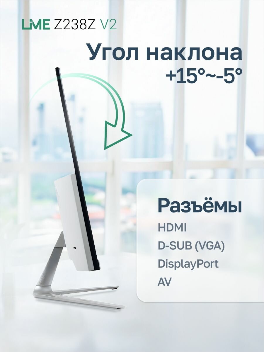 Монитор Lime оснащен технологией Flicker Free, благодаря которой у дисплея отсутствует мерцание, а у пользователя не развивается «синдром компьютерного зрения», глаза меньше устают. Углы обзора по вертикали и горизонтали составляют 178 градусов, что обеспечивает IPS-матрица. Она считается лучшей и по качеству цветопередачи.