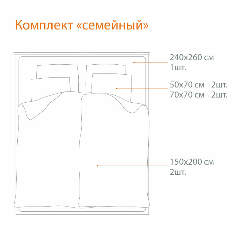 | Комплектация | Пододеяльник 150x200см - 2шт; простыня 240x260см - 1шт; наволочка 50x70см - 2шт, 70x70см - 2шт |