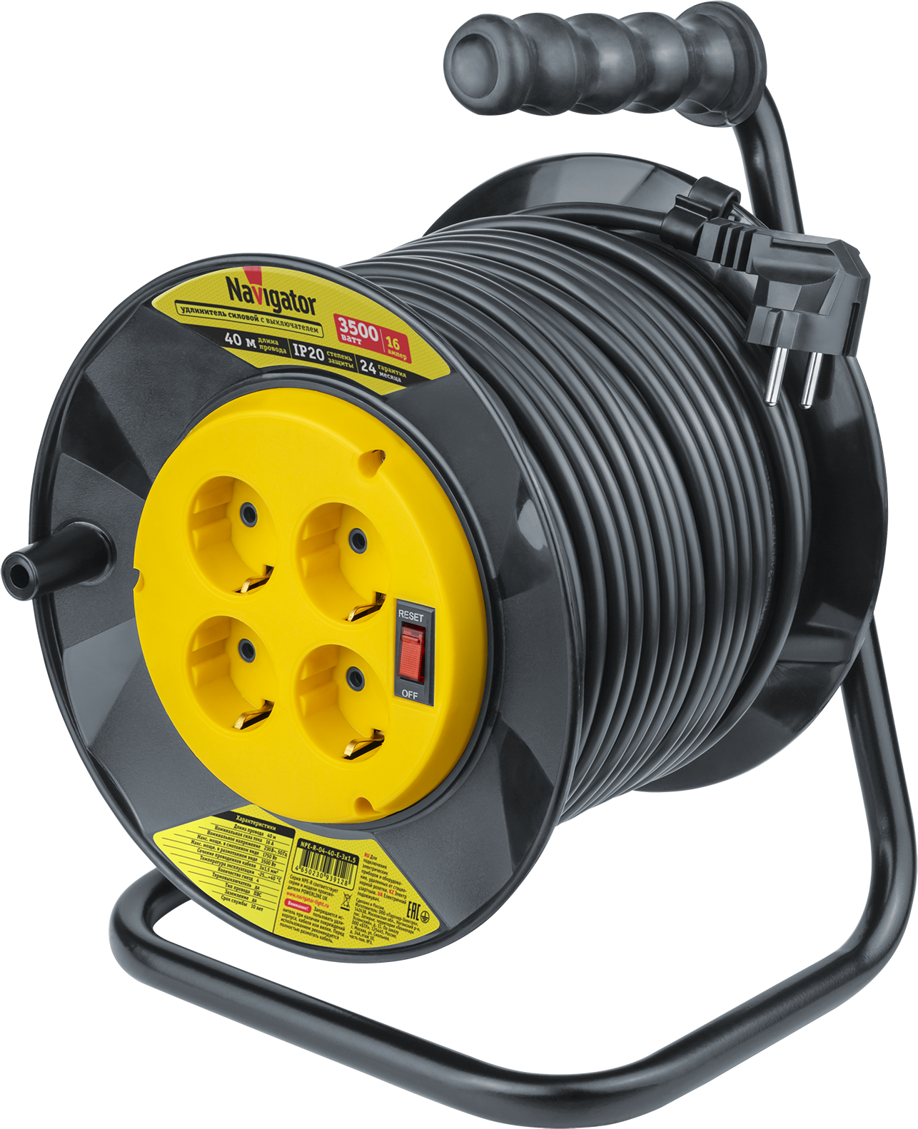 удлинитель на катушке NAVIGATOR 4 гнезда ПВС с/з с выкл IP20 3х15мм 16A 30м (93911)