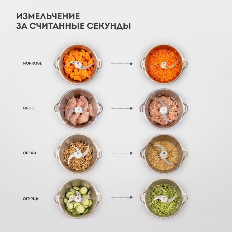 Прочная чаша изготовлена из особой марки нержавеющей стали AISI 304, которая устойчива к коррозии и воздействию солей, а также препятствует размножению микробов. Объем чаши – 1,8 л позволяет измельчить большое количество продуктов.
