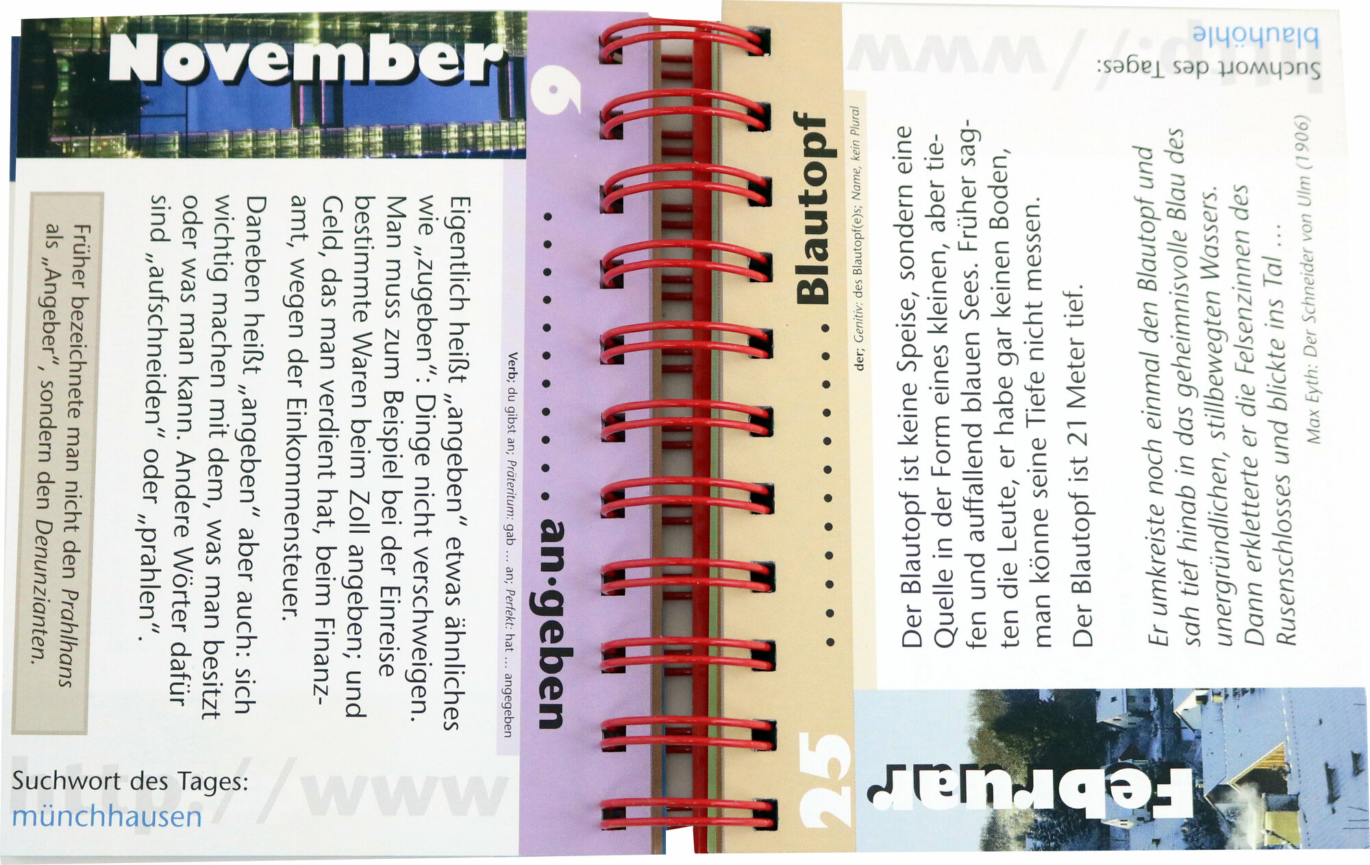Zu jedem Tag gibt es ein Stichwort: Manche dieser Stichworte haben einen konkreten Bezug zu genau diesem Tag, andere einen Bezug zum Monat oder zur Jahreszeit, wieder andere konnten an jedem beliebigen Tag des Jahres stehen. Zum Stichwort gibt es die wichtigsten Grammatikinfos sowie einen erklarenden Text zur Bedeutung bzw. zu den landeskundlichen oder historischen Konnotationen des Stichworts.