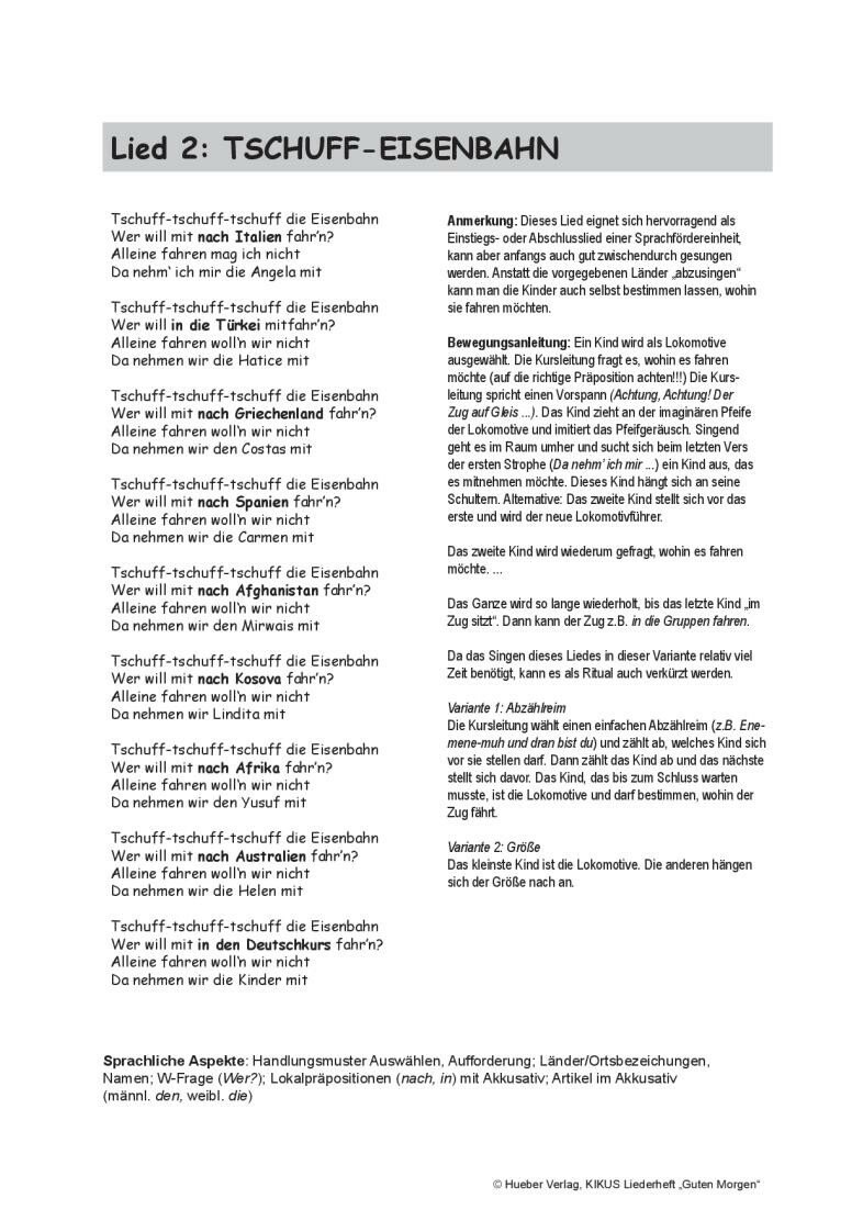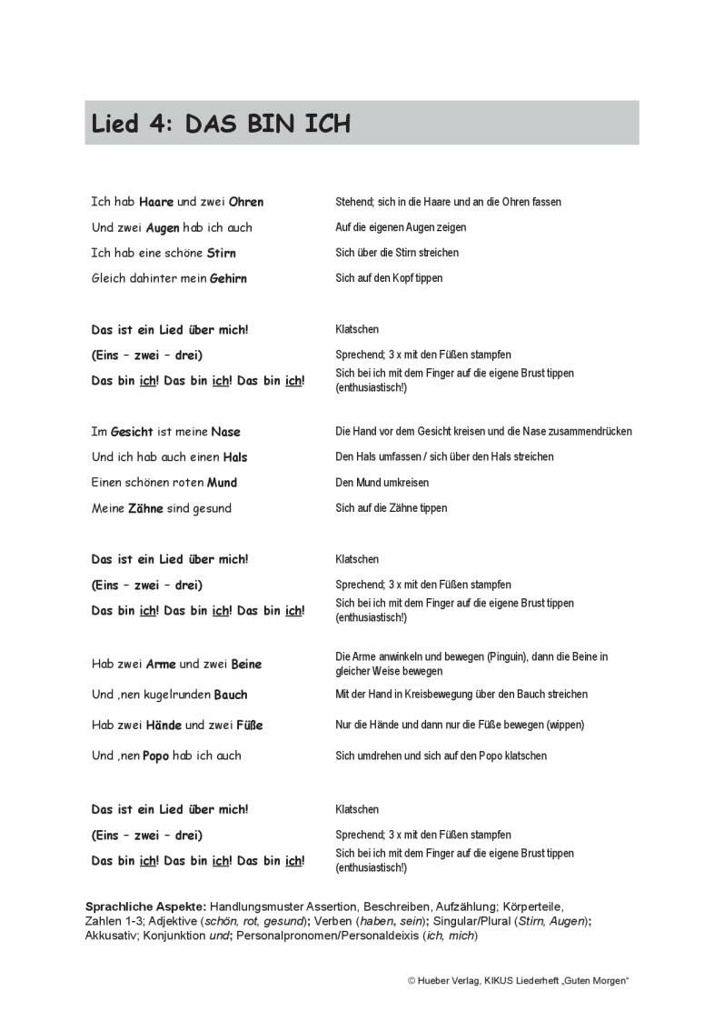 Idealerweise werden die Blatter einzeln an die Kinder ausgegeben, nachdem ein Lied im Sprachkurs eingefuhrt worden ist. Die Kinder konnen dann das Lied zu Hause immer wieder horen und sich mit den Bildern und „Ubungen“ der Blatter beschaftigen.