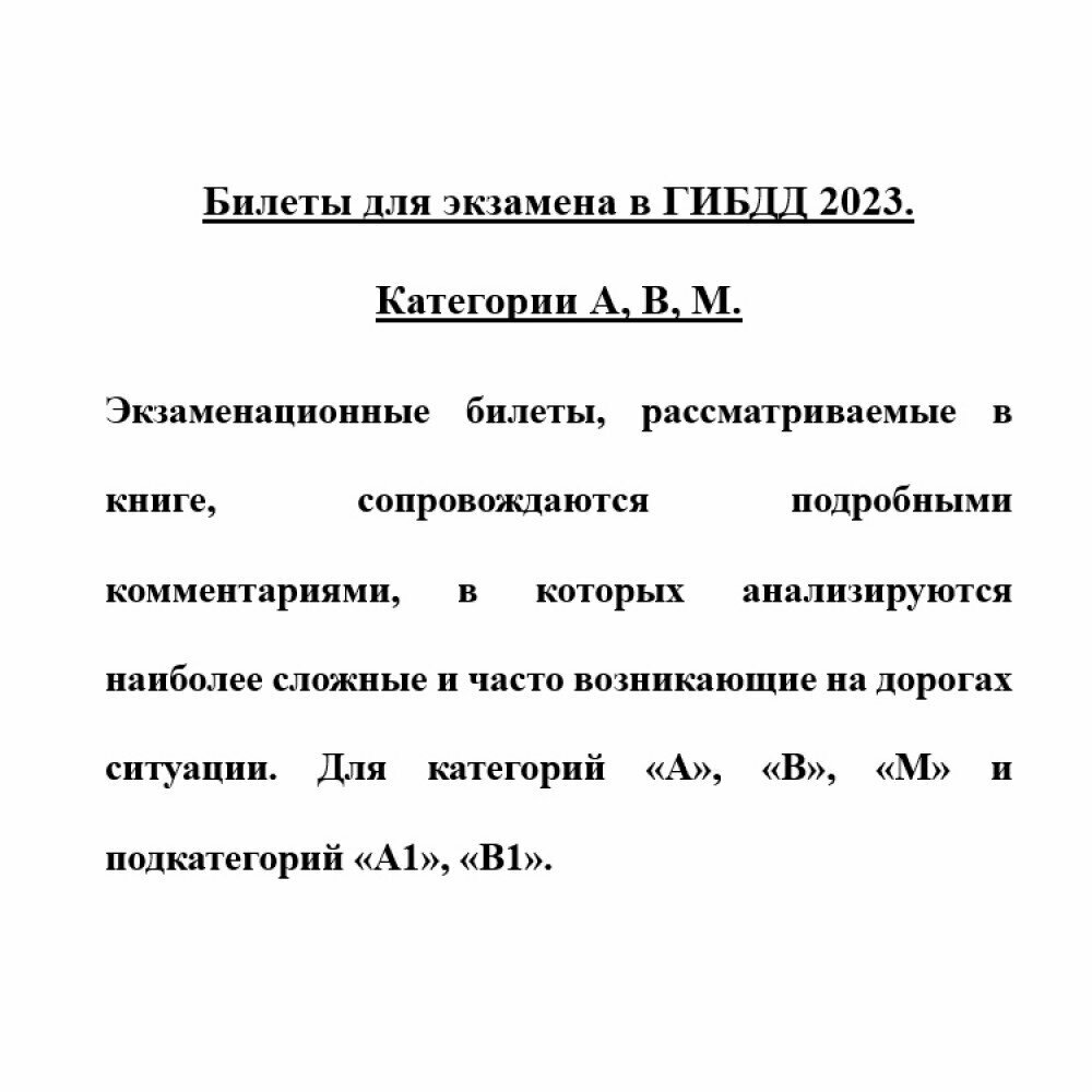 Экзаменационные билеты, рассматриваемые в книге, сопровождаются подробными комментариями, в которых анализируются наиболее сложные и часто возникающие на дорогах ситуации. Для категорий «A», «B», «M» и подкатегорий «А1», «B1».