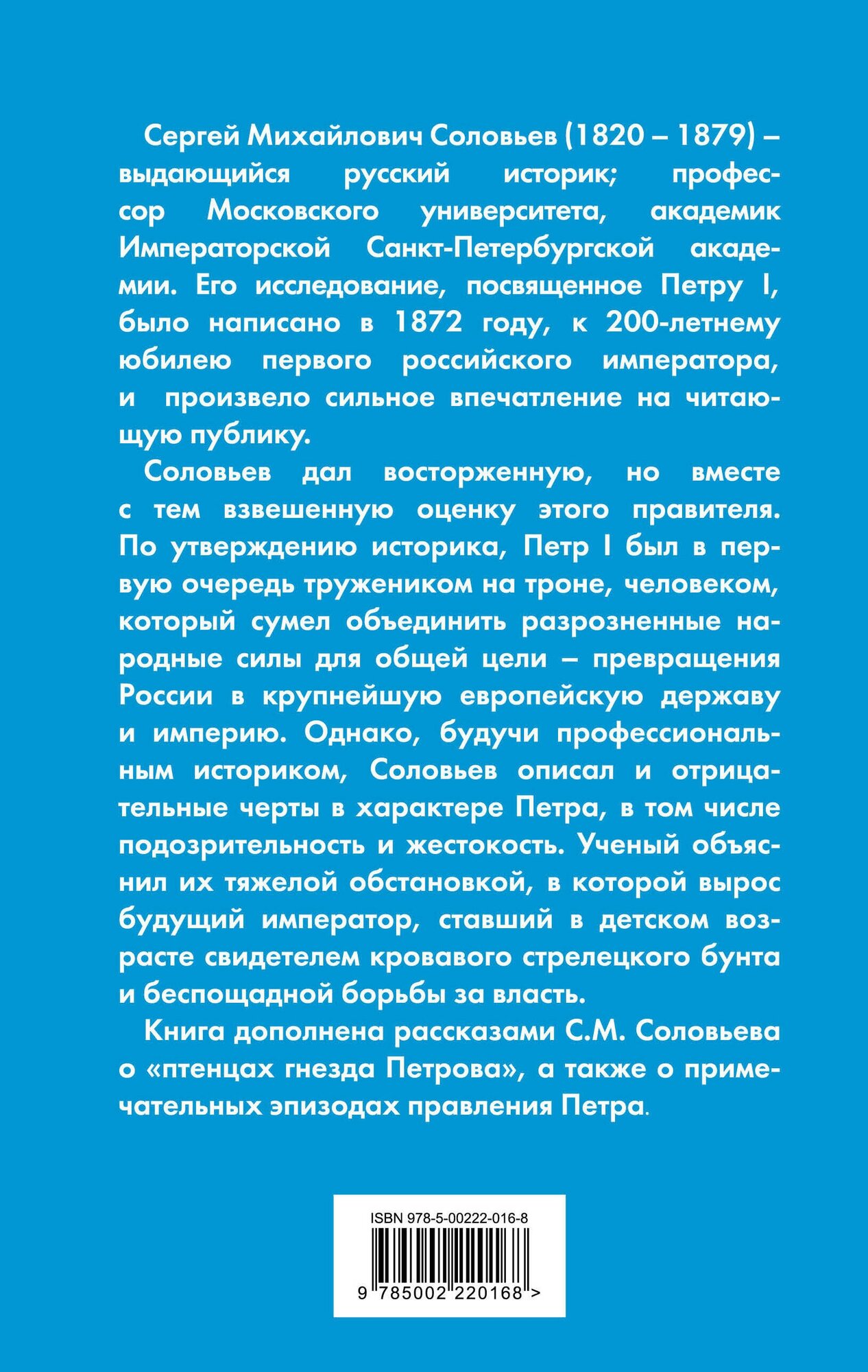Сергей Михайлович Соловьев (1820—1879) — выдающийся русский историк; профессор Московского университета, академик Императорской Санкт-Петербургской Академии. Его исследование, посвященное Петру I, было написано в 1872 году, к 200-летнему юбилею первого российского императора, и произвело сильное впечатление на читающую публику.