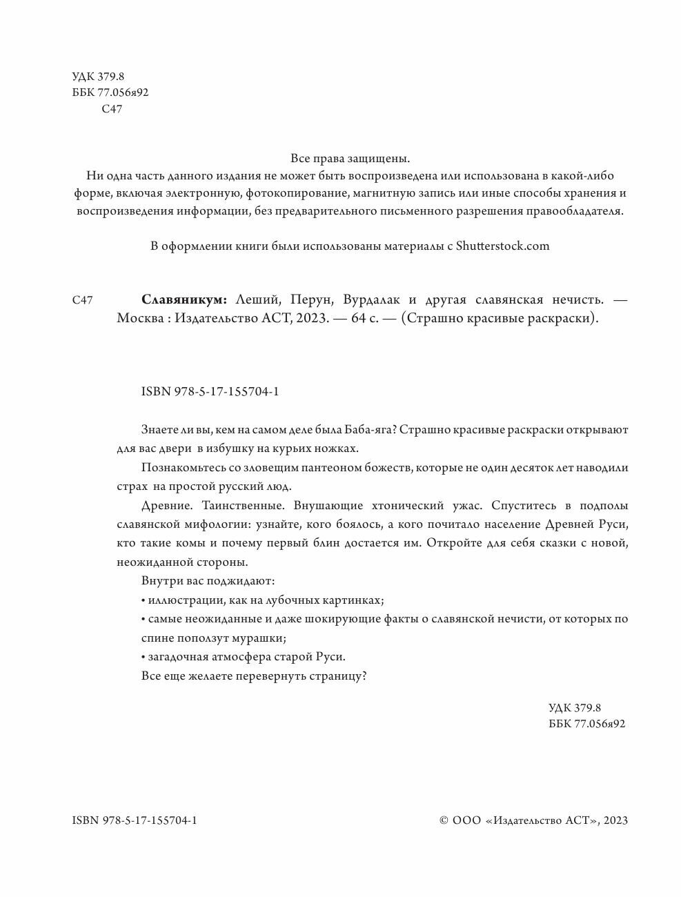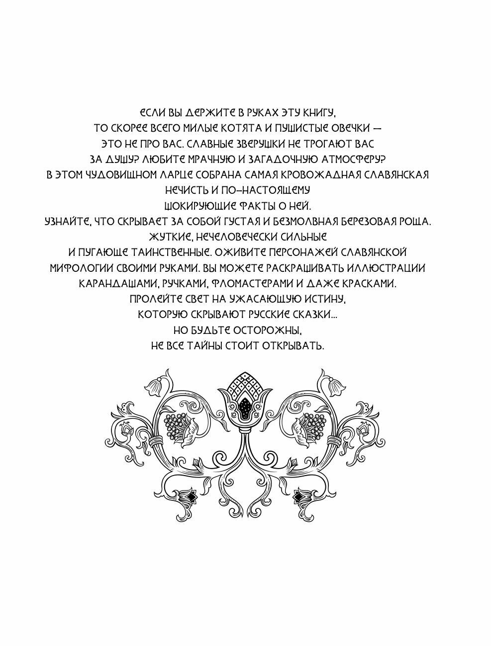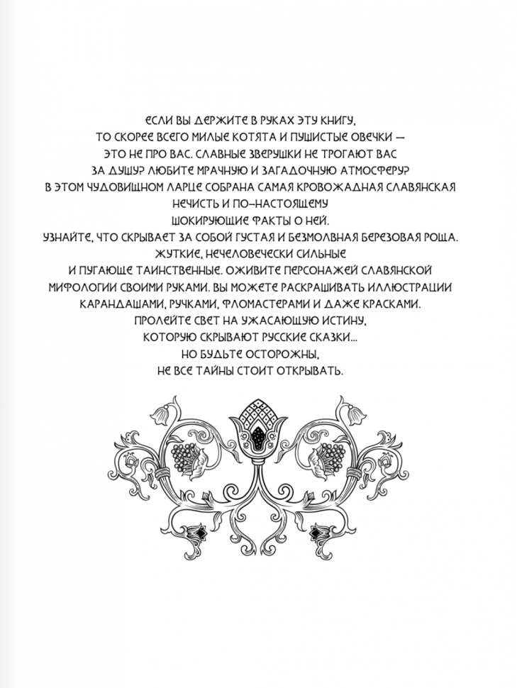 Книжка-раскраска, с небольшим описанием всевозможных старорусских персонажах сказок и мифов. Само издание небольшого размера и тоненькое. Обложка мягкая, тоненькая, с глянцевыми вставками, листы белые, плотный офсет, раскрашивать лучше цветными карандашами, чтобы все-таки потом можно было любоваться уже цветными картинками. Стоит возрастное ограничение 16+. Поэтому к покупке как взрослую антистресс-раскраску, очень советую.