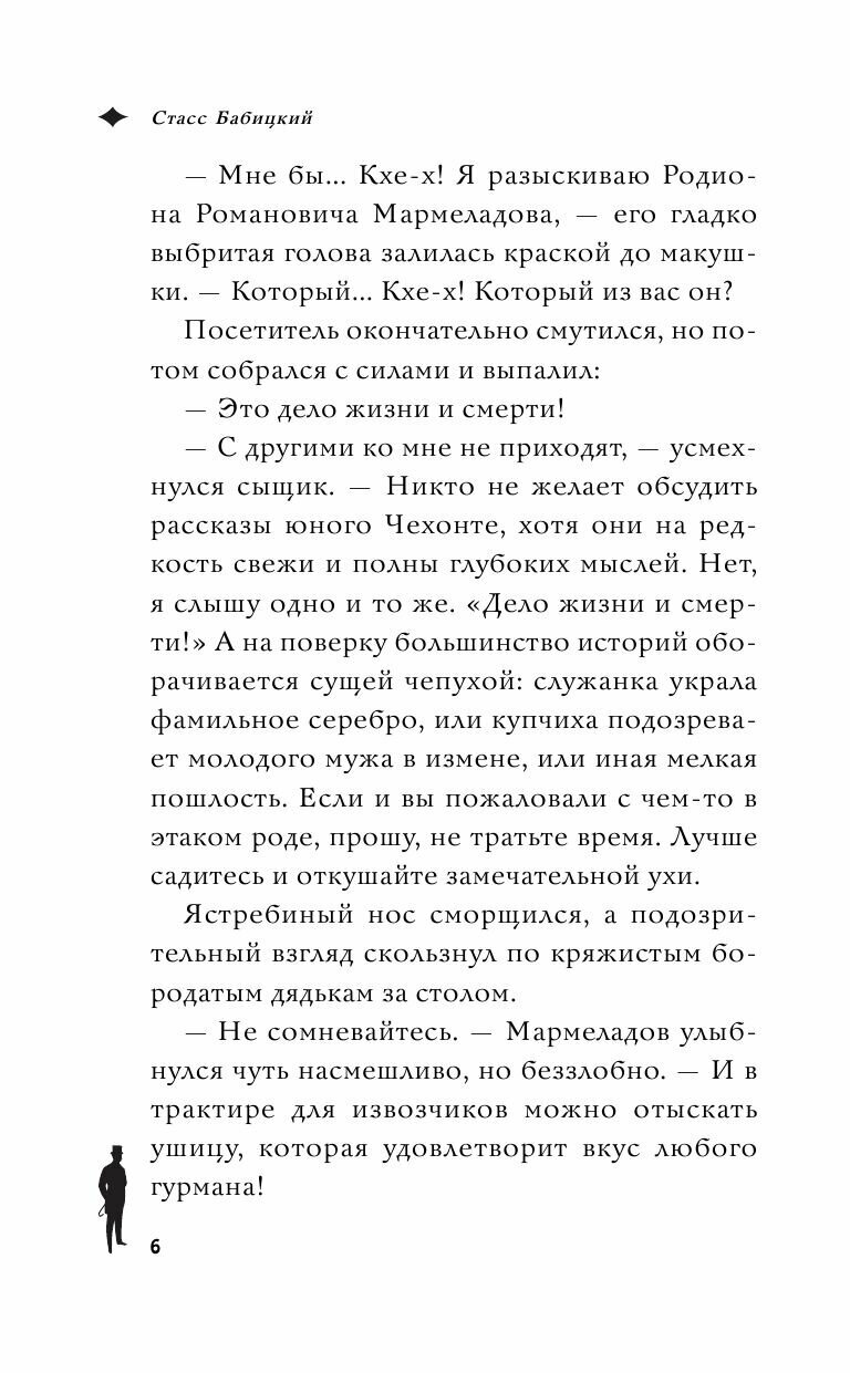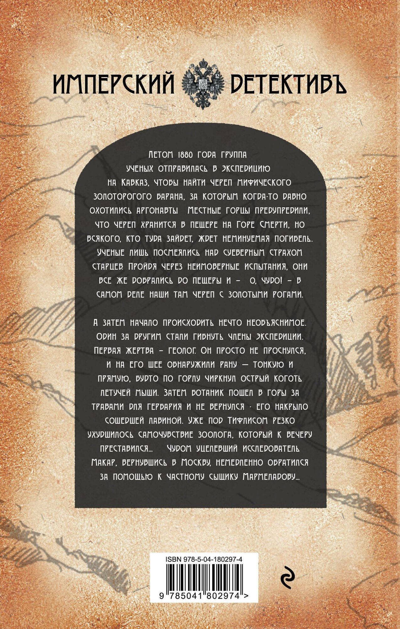 А затем начало происходить нечто необъяснимое. Один за другим стали гибнуть члены экспедиции. Первая жертва — геолог. Он просто не проснулся, и на его шее обнаружили рану — тонкую и прямую, будто по горлу чиркнул острый коготь летучей мыши. Затем ботаник пошел в горы за травами для гербария и не вернулся — его накрыло сошедшей лавиной. Уже под Тифлисом резко ухудшилось самочувствие зоолога, который к вечеру преставился… Чудом уцелевший исследователь Макар, вернувшись в Москву, немедленно обратился за помощью к частному сыщику Мармеладову…