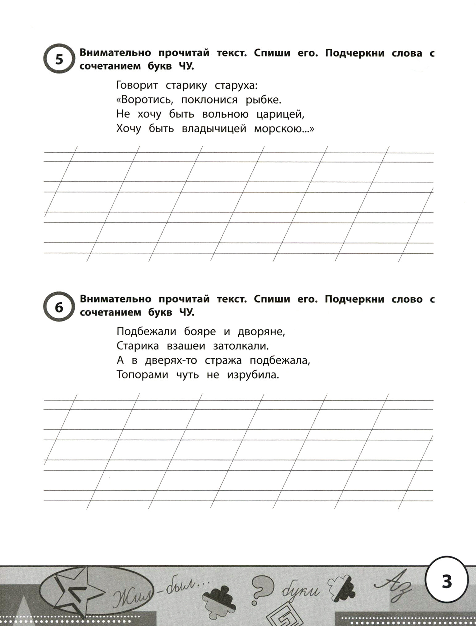 Цель пособия - формирование у детей орфографической зоркости, отработка навыка каллиграфического письма, закрепление правил русского языка. В пособии для списывания предлагаются фрагменты сказок А. С. Пушкина "Сказка о рыбаке и рыбке" и "Сказка о царе Салтане, о сыне его славном и могучем богатыре князе Гвидоне Салтановиче и о прекрасной царевне Лебеди". Каждый фрагмент сопровождается дополнительными орфографическими и грамматическими заданиями.
