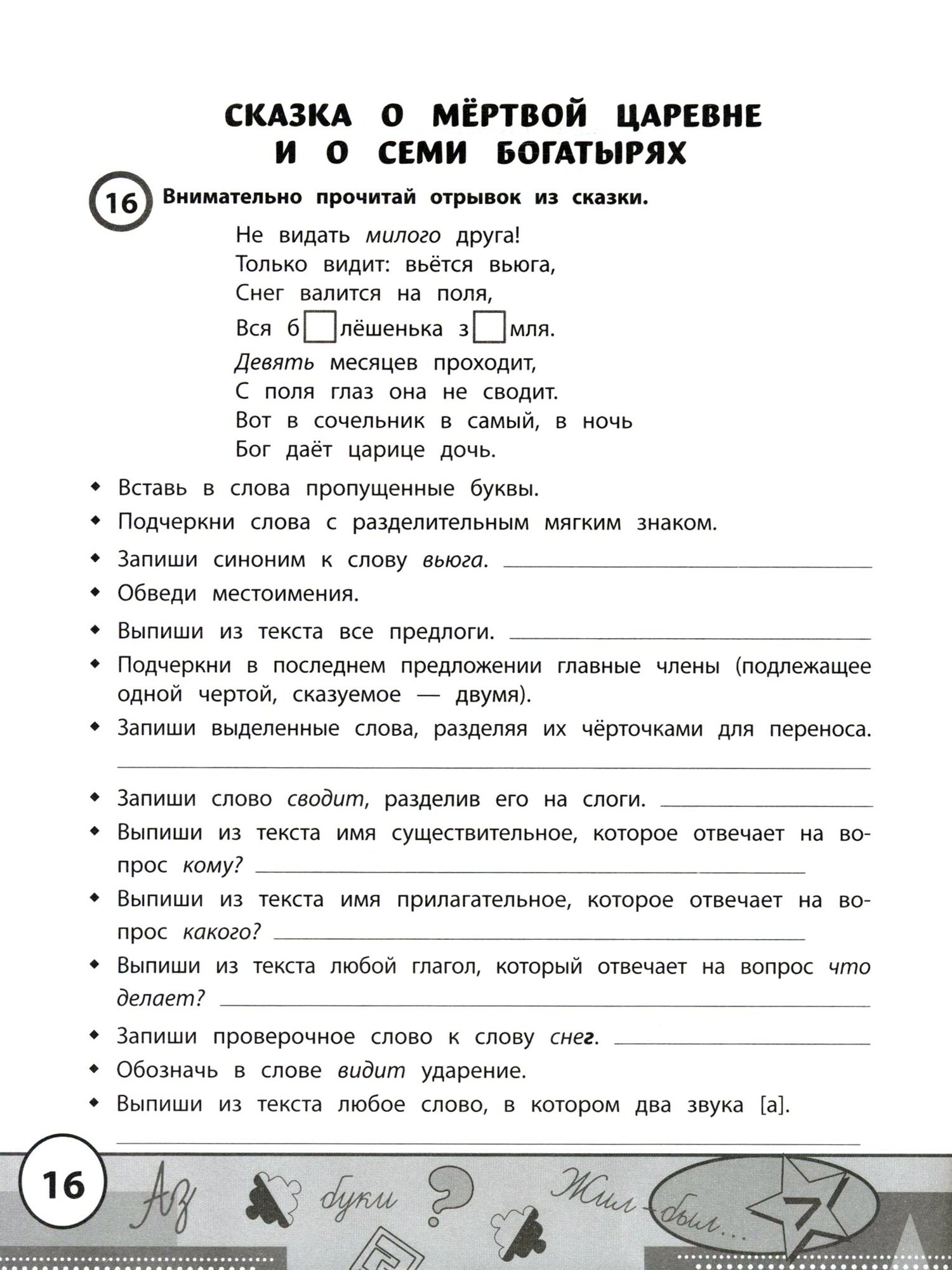 Сборник включает комплекс упражнений для проверки и закрепления знаний программы по русскому языку для учеников начальной школы. В пособие включены фрагменты сказок А. С. Пушкина "Сказка о золотом петушке" и "Сказка о мёртвой царевне и о семи богатырях", которые сопровождаются разнообразными орфографическими и грамматическими заданиями.