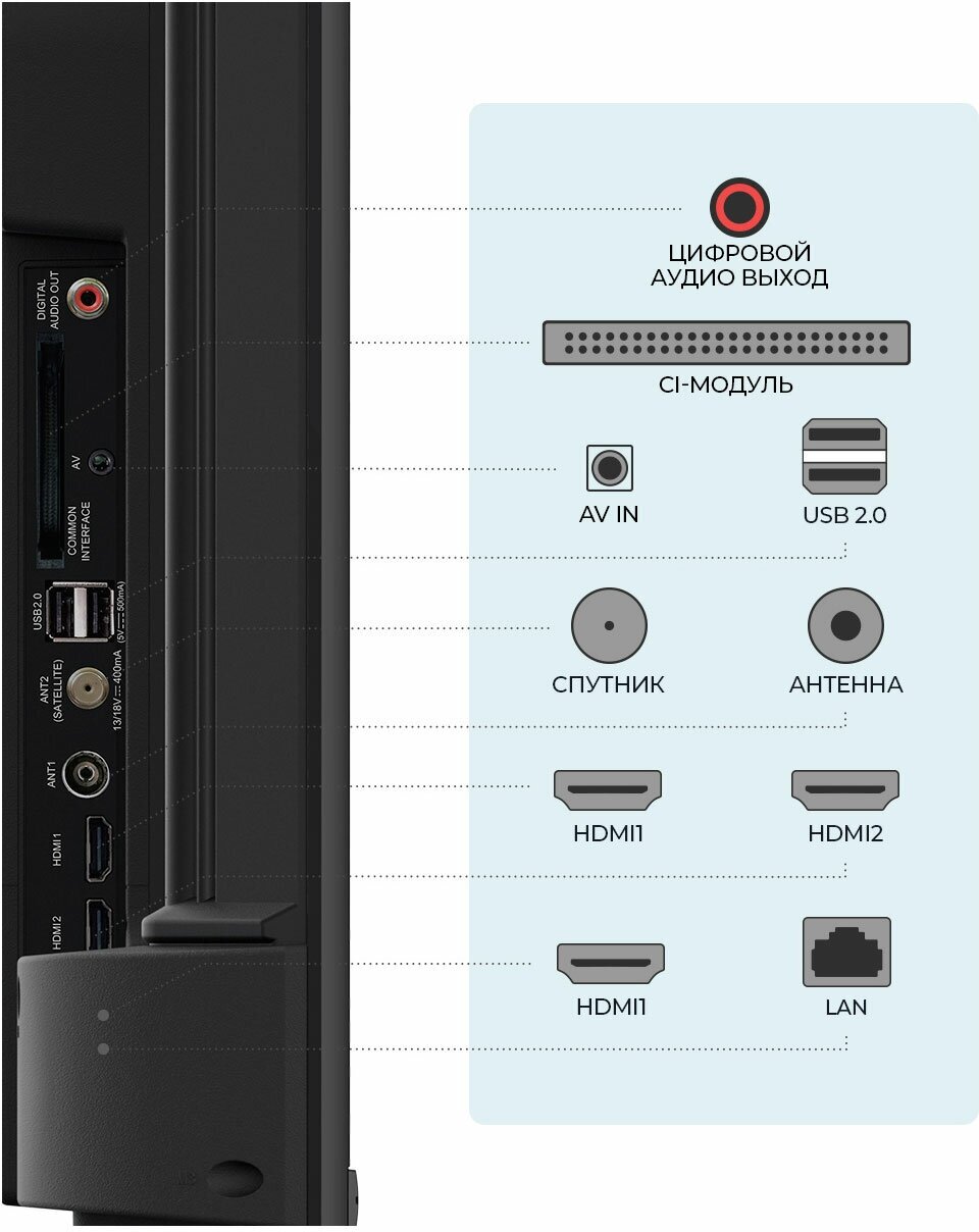 | Разъемы и интерфейсы | USB x2, HDMI 2.0, антенный вход, вход спутниковой антенны, композитный AV |