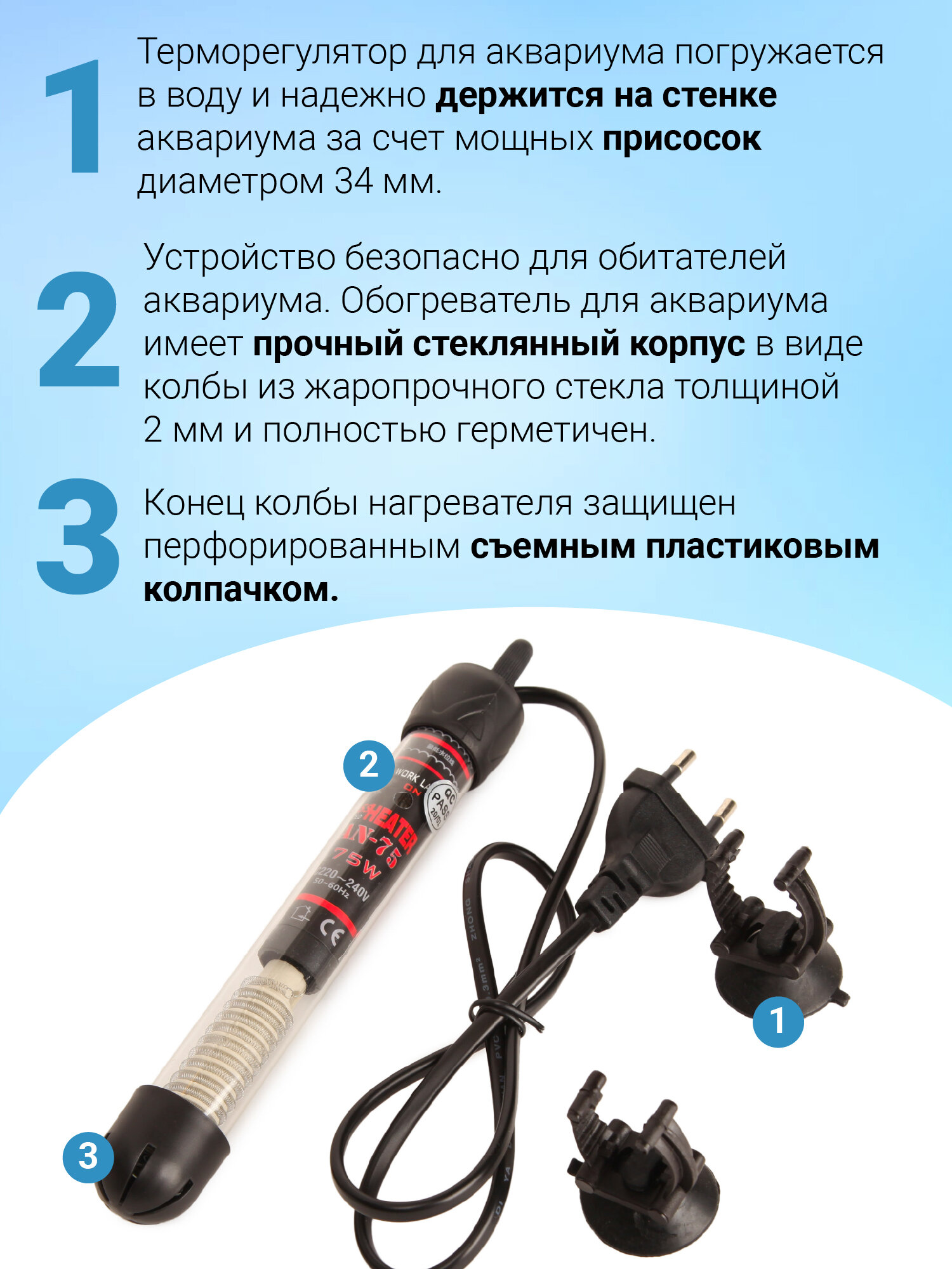Нагреватель для аквариума с терморегулятором Aqua Reef (Аква Риф) AN-75 предназначен для пресноводных и морских аквариумов объемом от 70 до 100 л. Прибор необходим для подогрева и контроля температуры воды в аквариуме. Мощность устройства 75 Вт. Устройство нагревает воду в аквариуме от +20 до + 32 °С, с погрешностью ± 1 °C.Обогреватель для аквариума имеет прочный стеклянный корпус в виде колбы из жаропрочного стекла толщиной 2 мм и полностью герметичен (IP68). Имеется регулировка температуры. Терморегулятор для аквариума погружается в воду и надежно держится на стенке аквариума за счет мощных присосок диаметром 34 мм. Нагреватель для воды можно установить в вертикальном или горизонтальном положении. Включенная лампочка на корпусе устройства сигнализирует о том, что идет процесс нагрева воды. Когда температура воды достигнет заданного параметра, прибор автоматически отключается и лампочка гаснет.Длина нагревателя: 195 мм (с регулятором) / 175 мм (без регулятора). Гарантия: 1 год.