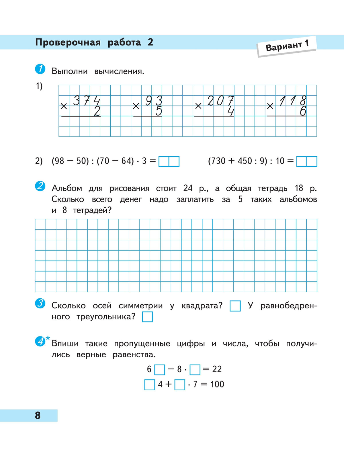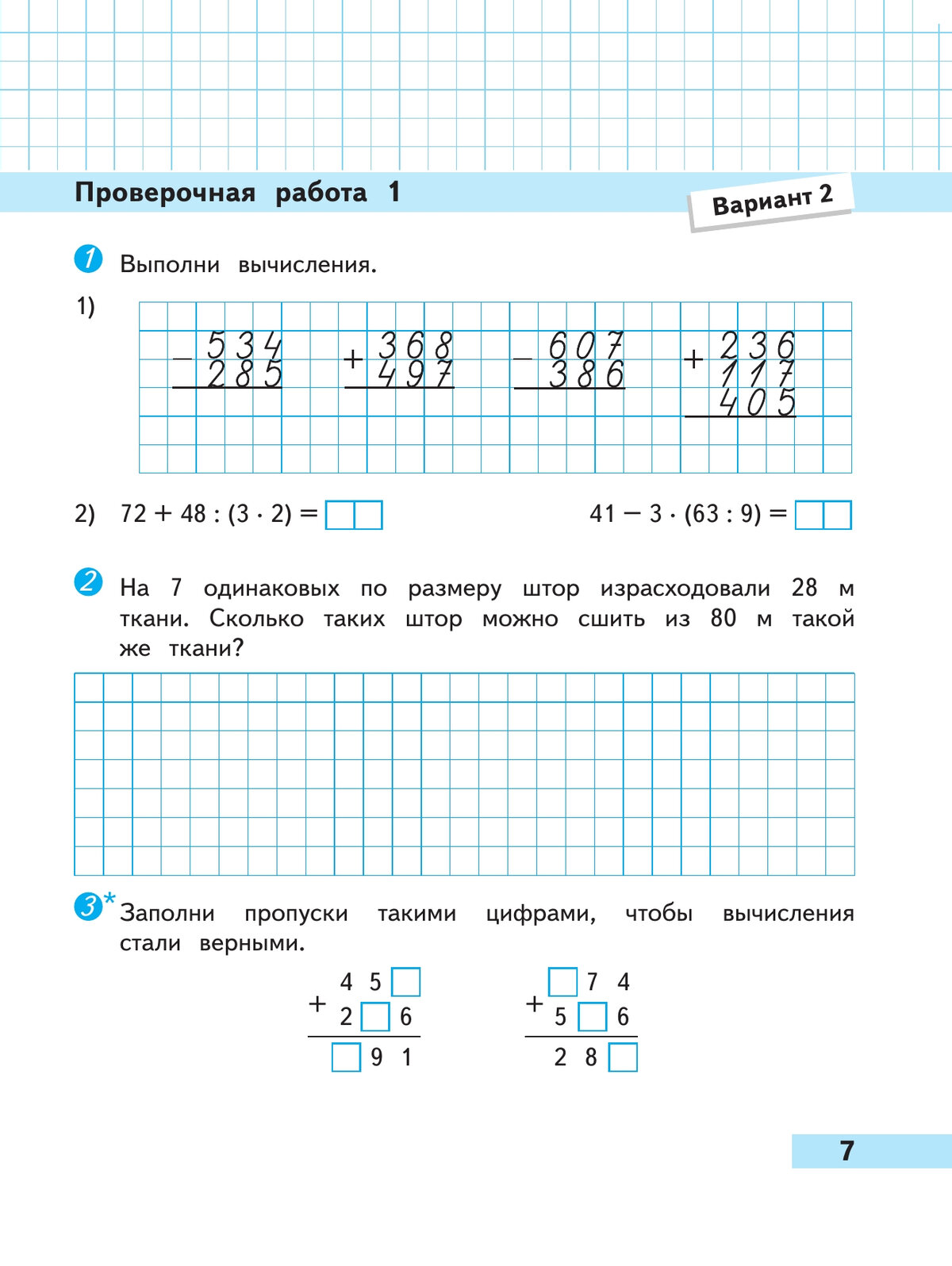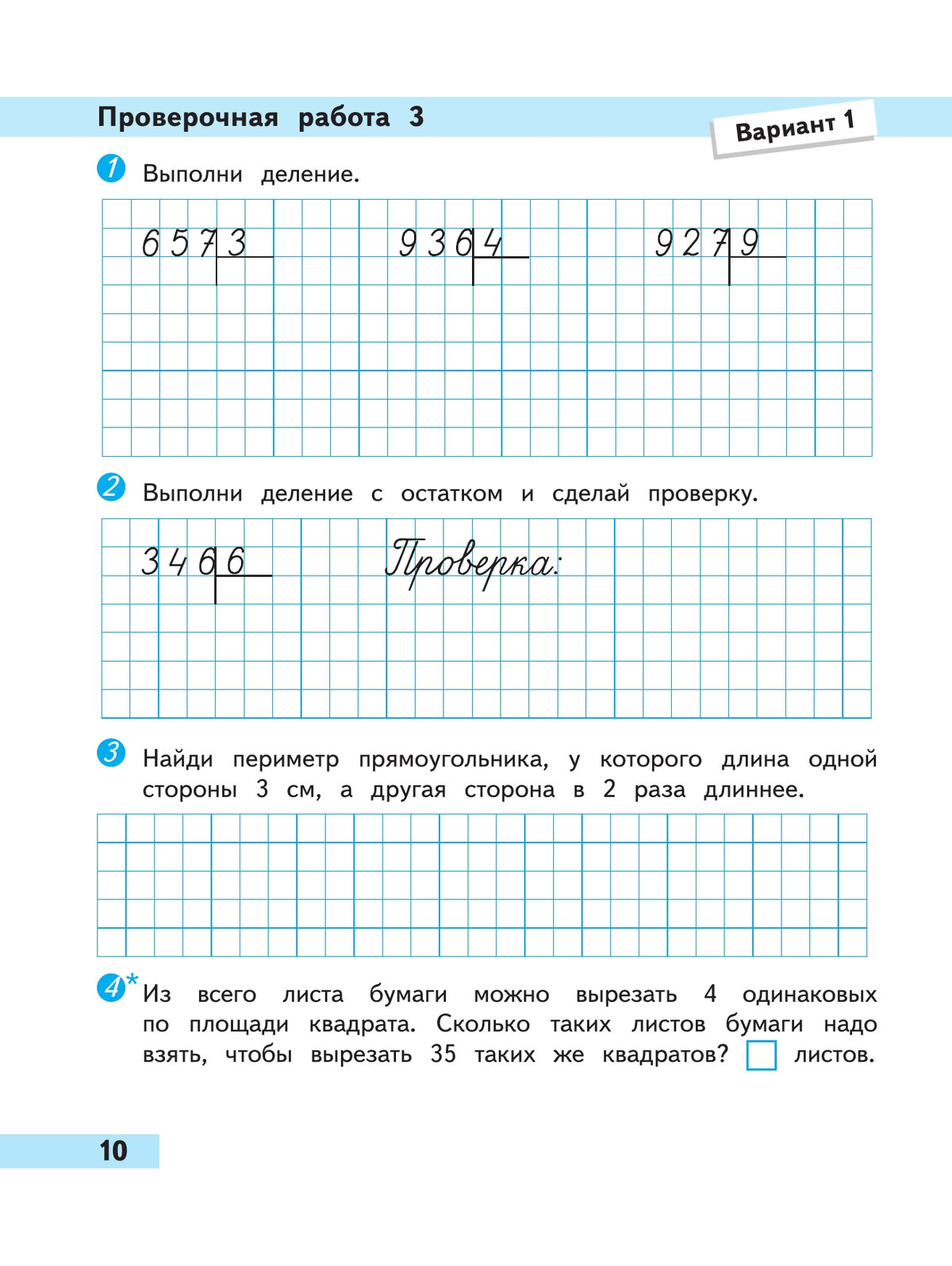 В проверочных работах даётся от 3-х до 5 заданий ( например, решить задачу, выполнить вычисления, найти периметр, площадь, решить уравнения, сравнить выражения, заполнить пропуски верными значениями величин и др.).