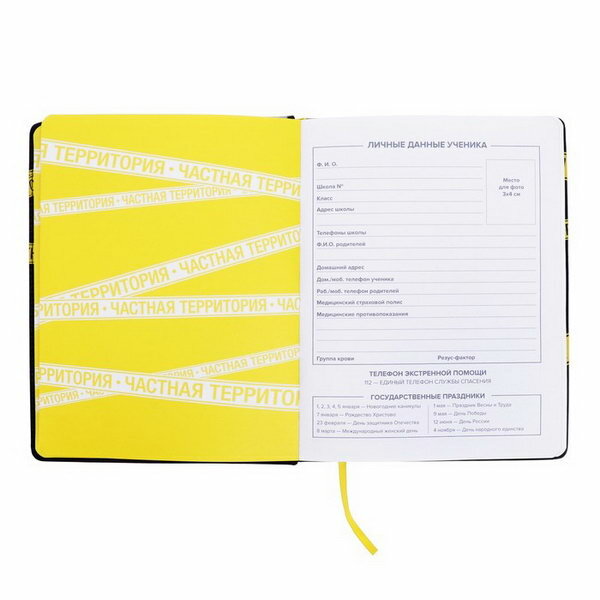 Дневник школьный, Частная территория, формат А5+, 48 л., твёрдый переплёт с поролоном. Обложка: искусственная кожа "Нубук", печать люминесцентной краской, обстрочка по периметру, углы обложки закруглённые, углы блока закруглённые, отделка среза: окрашивание пантоном, одно ляссе, красочность форзаца: печать пантоном, красочность блока: печать в одну краску. Блок: бумага - белый офсет, 80 г/м?, универсальная шпаргалка. Индивидуальная упаковка: ПЭТ-пакет.