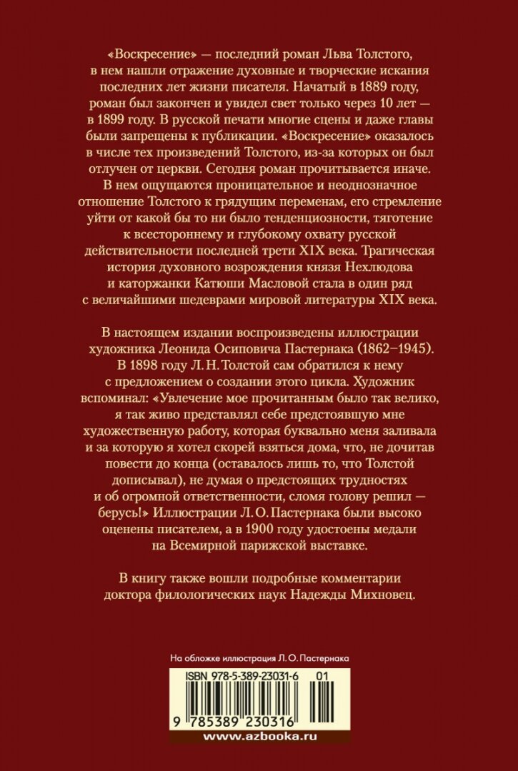 В настоящем издании воспроизведены иллюстрации к роману художника Леонида Осиповича Пастернака (1862-1945). В 1898 году Л. Н. Толстой сам обратился к нему с предложением о создании этого цикла. Иллюстрации Л. О. Пастернака были высоко оценены писателем, а в 1900 году удостоены медали на Всемирной парижской выставке. В книгу также вошли подробные комментарии доктора филологических наук Н. Г. Михновец.
