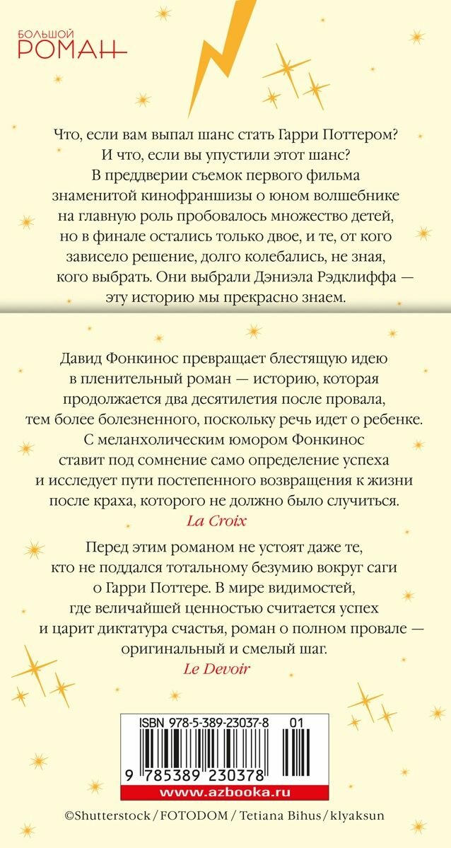 В преддверии съемок первого фильма знаменитой кинофраншизы о юном волшебнике на главную роль пробовалось множество детей, но в финале остались только двое, и те, от кого зависело решение, долго колебались, не зная, кого выбрать. Они выбрали Дэниэла Рэдклиффа - эту историю мы прекрасно знаем. Но Давид Фонкинос написал не о нем - он написал о том, кого мы не знаем: о том, кого не выбрали. Это тоже история о Мальчике, Который Выжил, но у этого мальчика жизнь выстроилась вокруг гигантского умолчания под названием "Гарри Поттер и мой провал" - целая жизнь с пустотой вместо центра, и сколько ни ходи по кругу, избежать пустоты не удастся. Как преодолеть поражение, в котором ты не виноват? Как вернуть себе жизнь, которую у тебя украли? Стать невидимкой, стать Гарри Поттером, стать собой? Перед вами история о волшебстве - но заклинаниями здесь дело не ограничится.