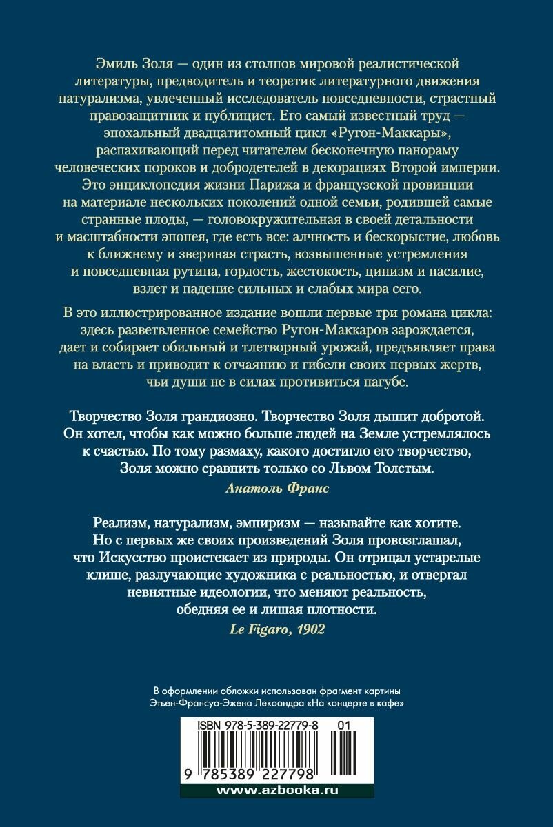 В это иллюстрированное издание вошли первые три романа цикла в том порядке, в котором его рекомендовал читать автор: здесь разветвленное семейство Ругон-Маккаров зарождается, дает и собирает обильный и тлетворный урожай, предъявляет права на власть и приводит к отчаянию и гибели своих первых жертв, чьи души не в силах противиться пагубе.