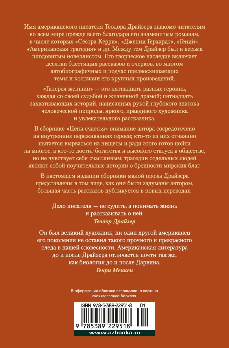 Никогда не сталкивался с небольшими по объёму произведениями Драйзера, поэтому считал его автором исключительно больших романов. Эта книга только лишь одним этим фактом сначала меня привлекла. Всё-таки писатель-романист и писатель-новеллист литераторы разные и пишут свои книги каждый по своему. Но в итоге Драйзер-новеллист покорил меня с первого же своего рассказа в сборнике \"Галерея женщин\". Настолько просто, настолько реально, настолько по-братски, по-соседски, по-свойски. Как-то примерно так я мысли и эмоции литературных героев прочувствовал. Очень правдивый и очень приятный литературный язык. А больше всего поражают характеры. \"Галерея характеров\" можно было бы эту книгу назвать, если бы не Драйзеровское неизменное уважение к женщине. Уважение в любом случае. Сборник \"Цепи счастья\" - это несколько другой стиль, но по писательскому мастерству \"Галерее женщин\" не уступает.