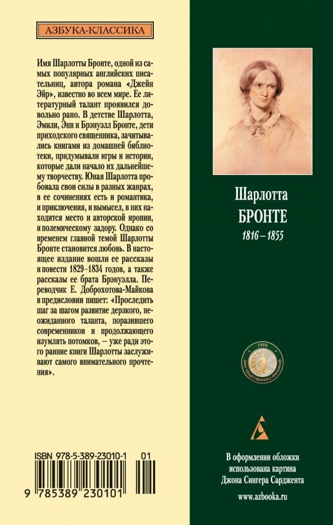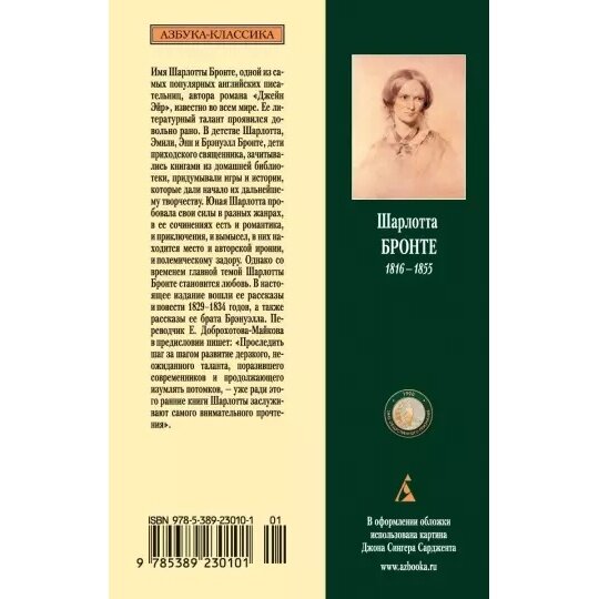 Имя Шарлотты Бронте, одной из самых популярных английских писательниц, автора романа «Джейн Эйр», известно во всем мире. Ее литературный талант проявился довольно рано. В детстве Шарлотта, Эмили, Энн и Брэнуэлл Бронте, дети приходского священника, зачитывались книгами из домашней библиотеки, придумывали игры и истории, которые дали начало их дальнейшему творчеству. Юная Шарлотта пробовала свои силы в разных жанрах, в ее сочинениях есть и романтика, и приключения, и вымысел, в них находится место и авторской иронии, и полемическому задору. Однако со временем главной темой Шарлотты Бронте становится любовь. В настоящее издание вошли ее рассказы и повести 1829–1834 годов, а также рассказы ее брата Брэнуэлла. Переводчик Е. Доброхотова-Майкова в предисловии пишет: «Проследить шаг за шагом развитие дерзкого, неожиданного таланта, поразившего современников и продолжающего изумлять потомков, — уже ради этого ранние книги Шарлотты заслуживают самого внимательного прочтения».