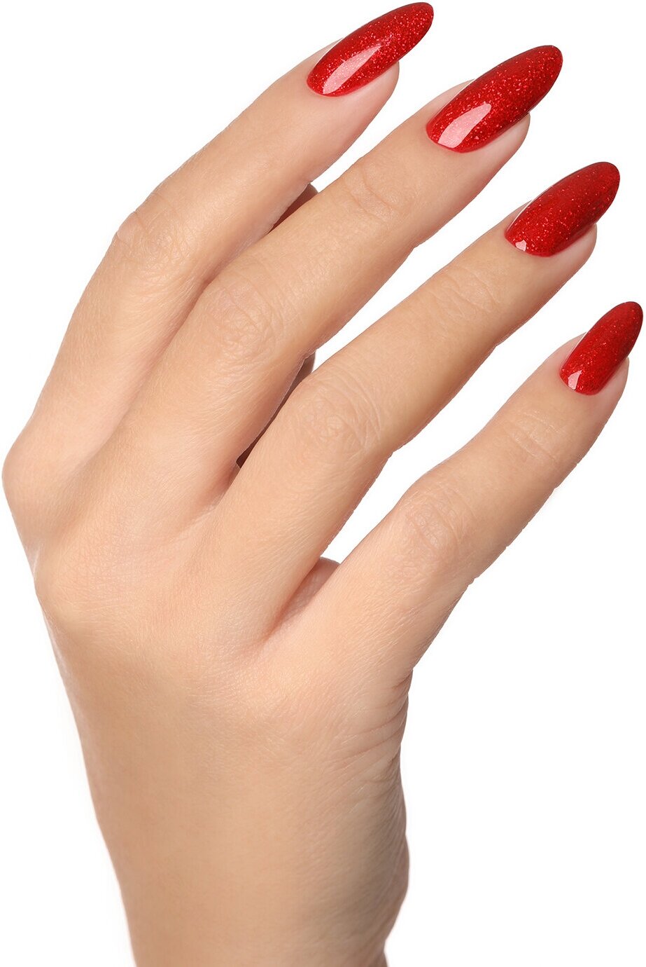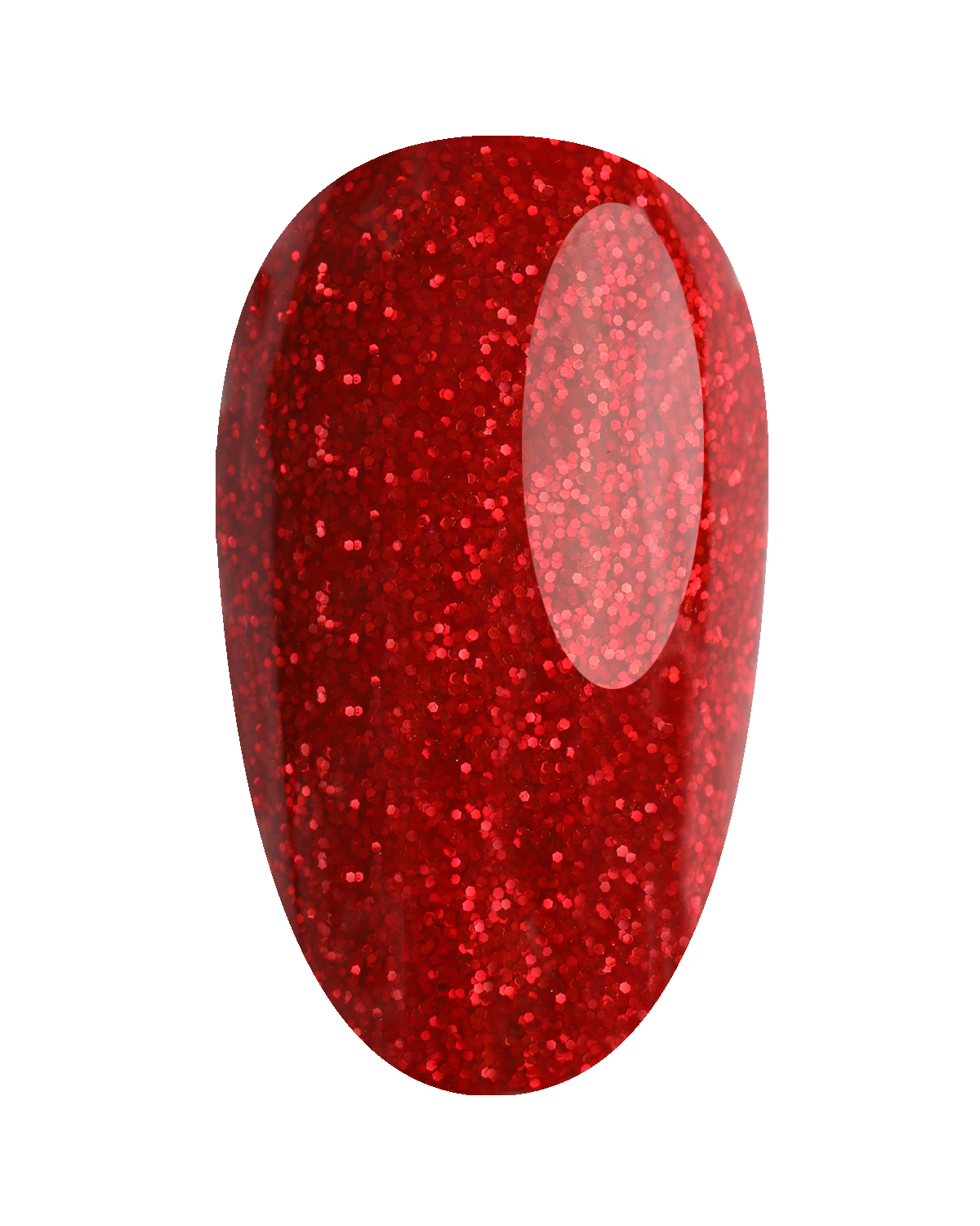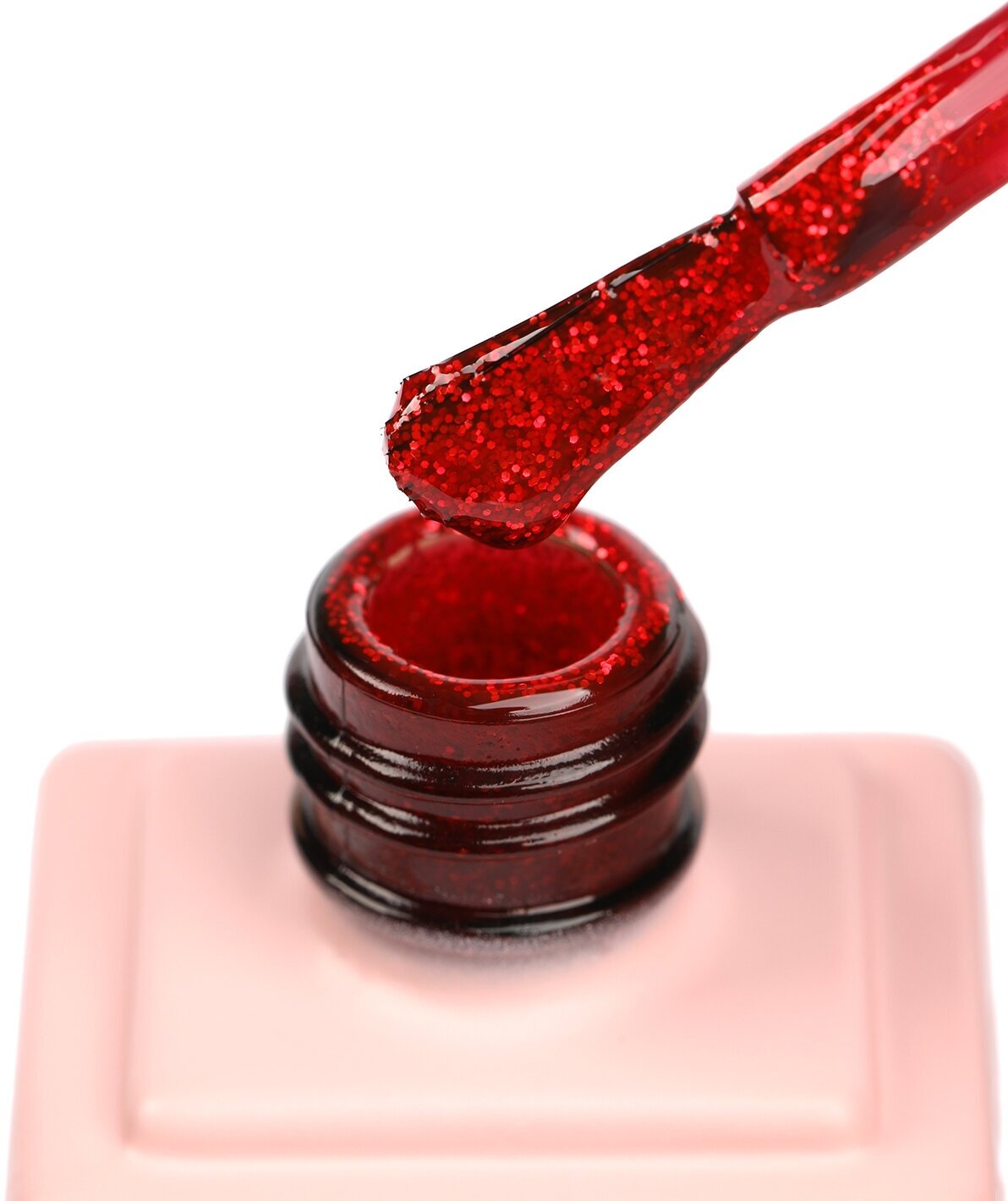 Ярко-красный оттенок гель-лака с крупными частицами шиммера, создающего выразительные переливы.