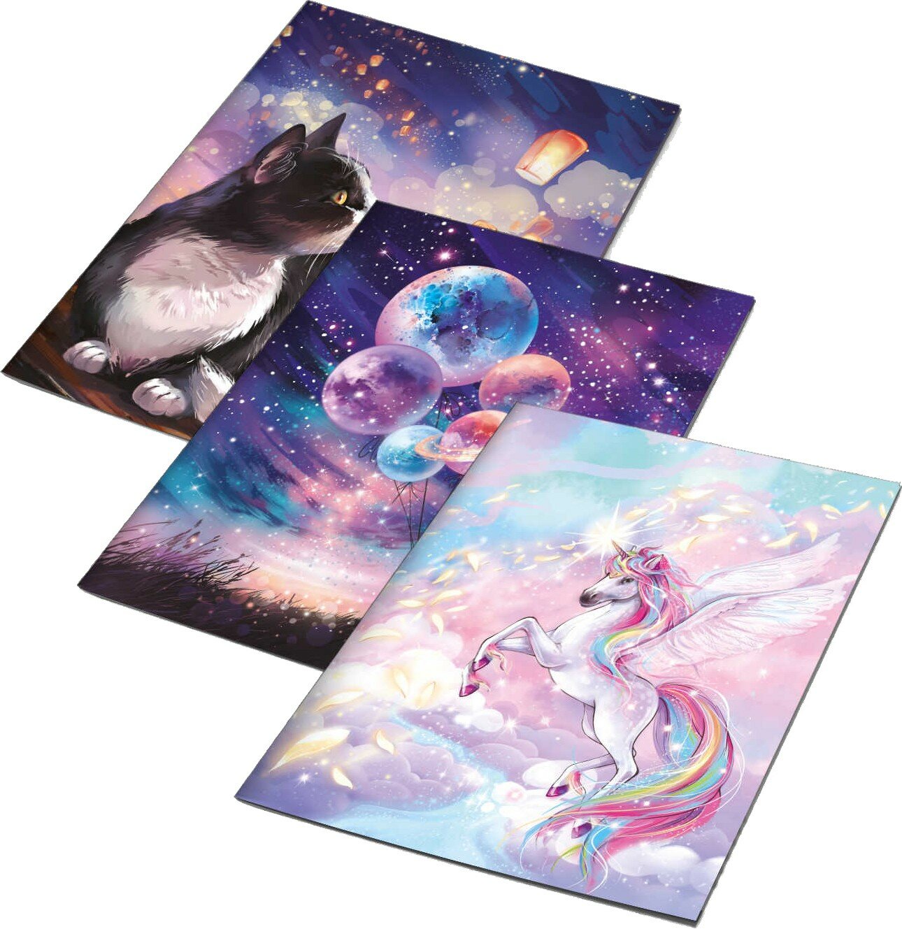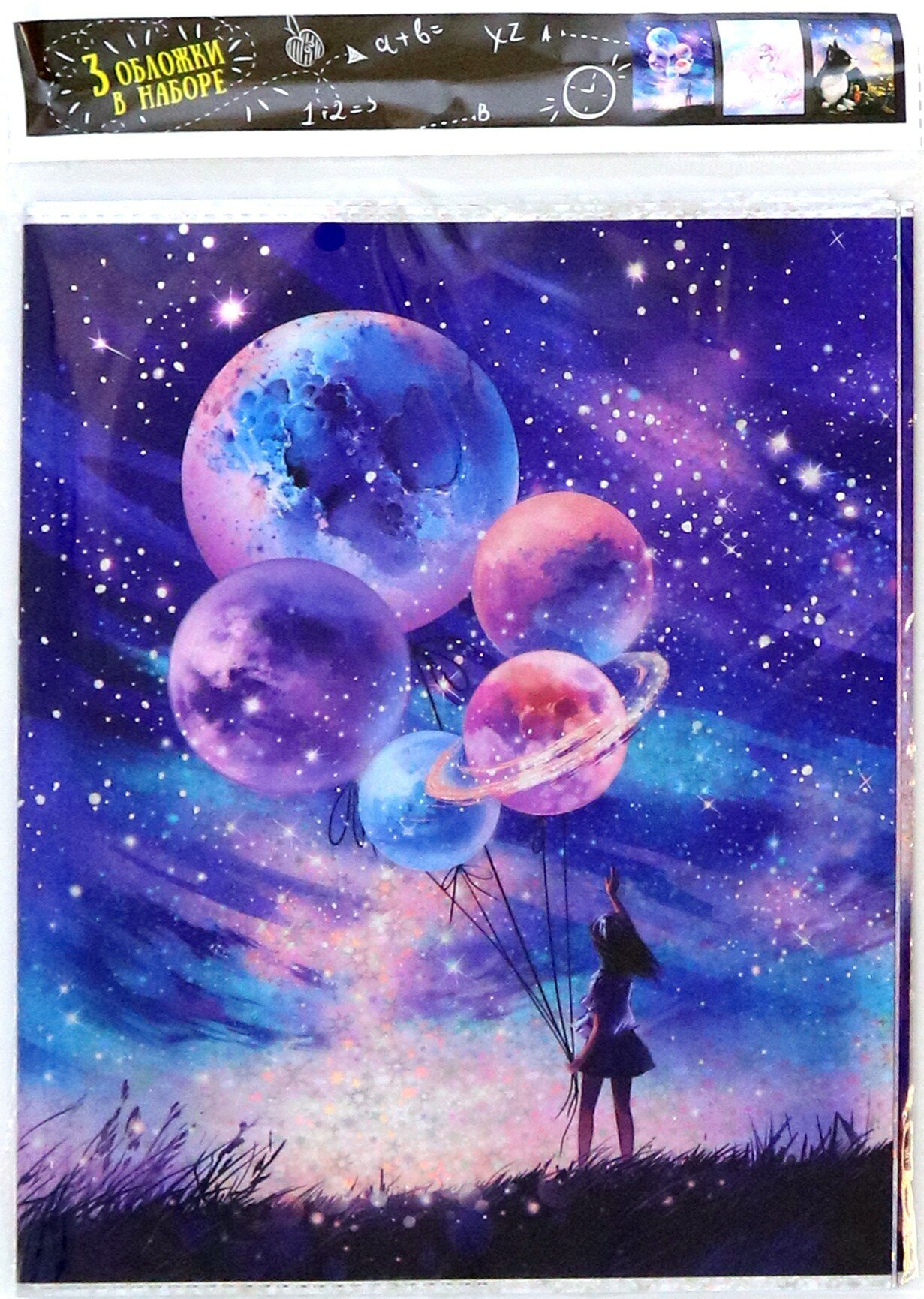 Обложки для тетрадей Феникс с голографическим рисунком Мечтай 3 штуки в наборе, 346×215 мм, цвет: розовый, сиреневый, ПВХ плотностью 70 мкм, особенности: вкладыш с тремя наклейками для персонализации, индивидуальная упаковка: ПЭТ-пакет с европодвесом.
