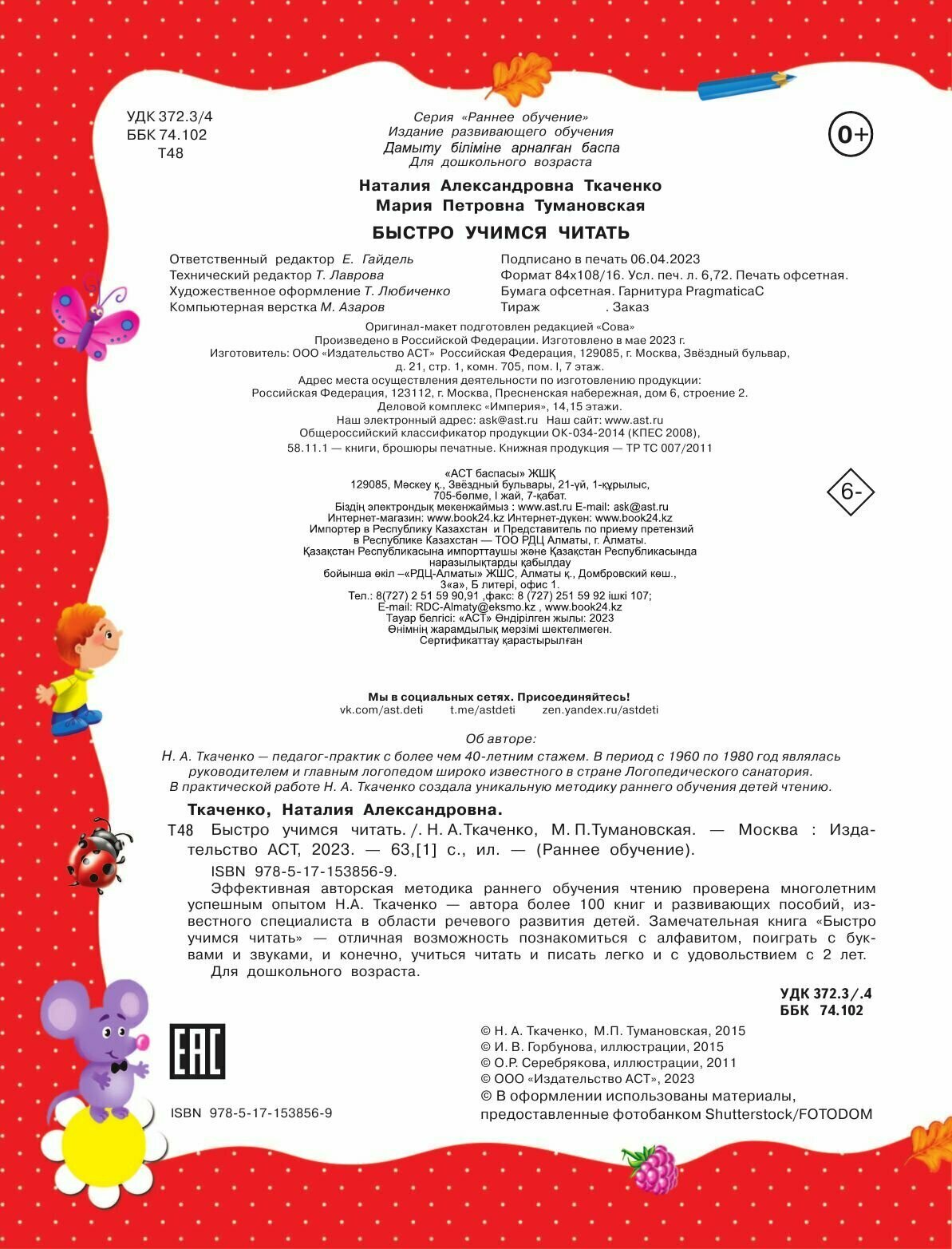 Быстро учимся читать: раннее обучение (Тумановская Мария Петровна, Ткаченко Николай Иванович); Сова. Малыш (Обучающая и развивающая литература), 2023