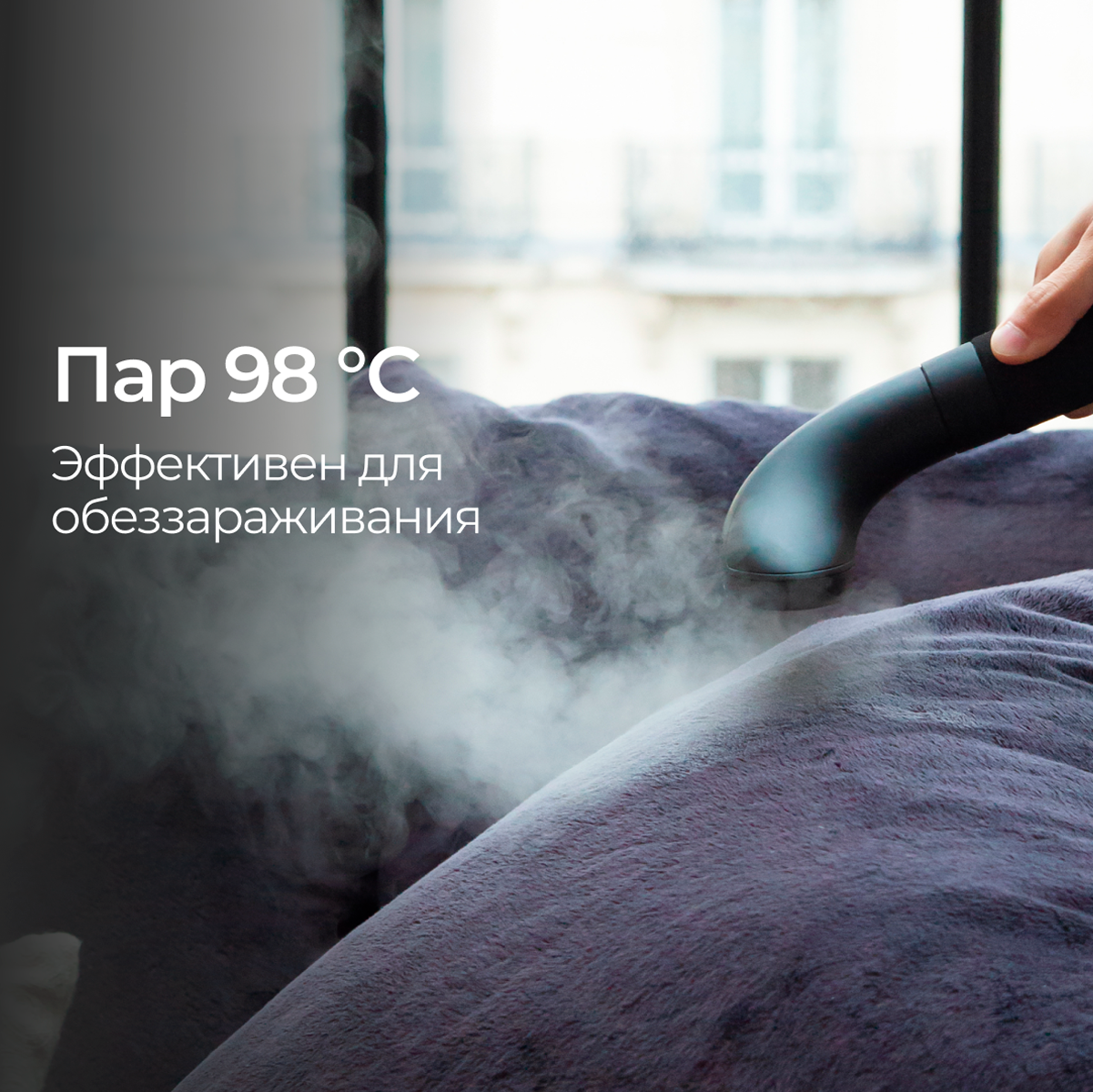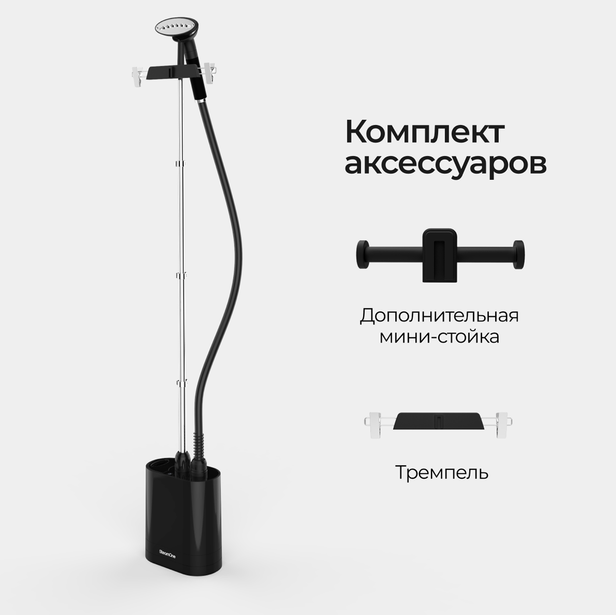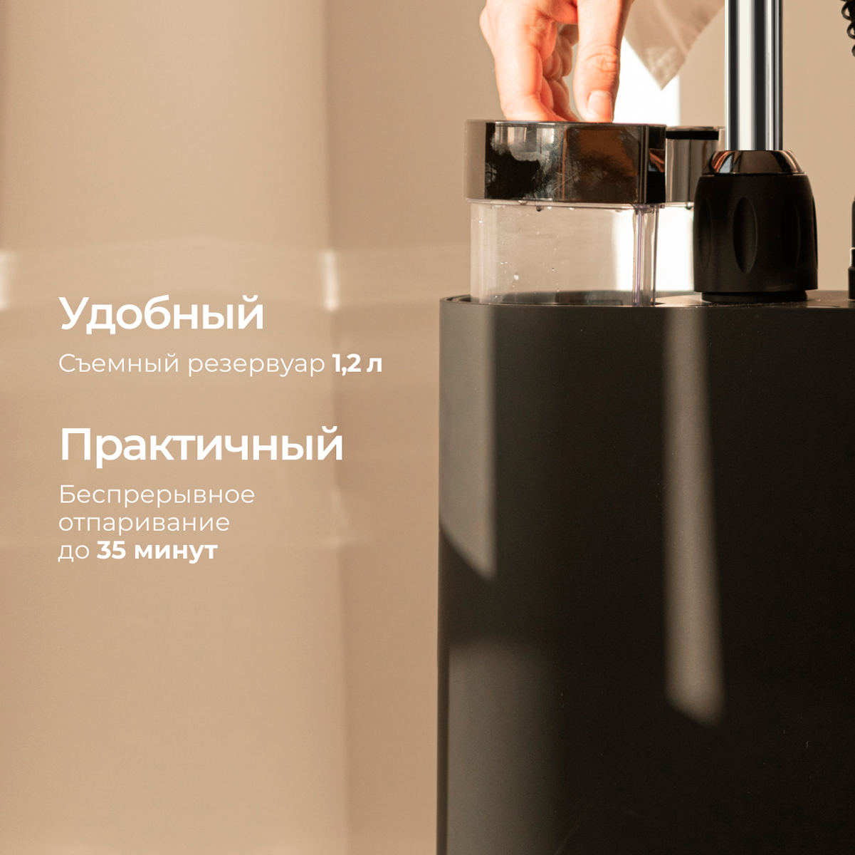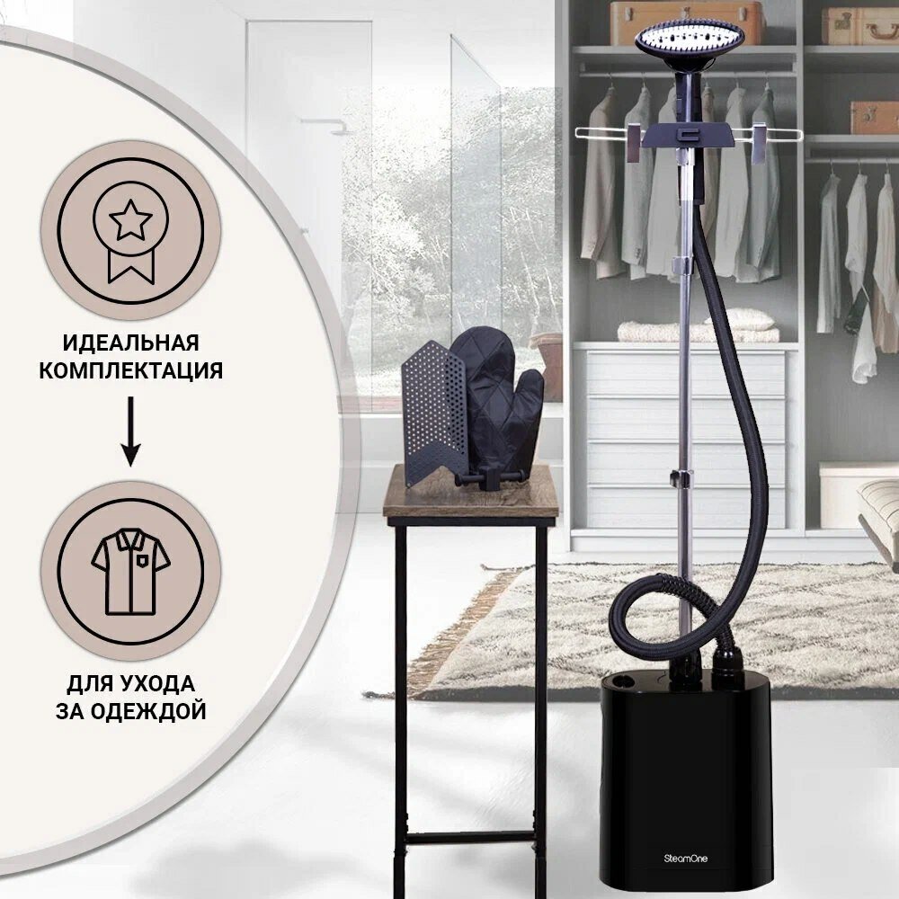 — это элегантный отпариватель, который подчеркнет ваш интерьер и станет лучшим помощником в уходе за одеждой. Его мощность в 1900 Вт позволит использовать мягкий непрерывный пар для разглаживания любого предмета одежды. Ключевые преимущества: • Простота в использовании • Мощность 1900 Вт • Готов к работе за 60 секунд Компактная конструкция с максимальной эффективностью. В приборе используется лучший алюминиевый нагреватель, чтобы обеспечить самую высокую скорость подачи пара на рынке и гарантировать наилучшее отпаривание от самых тонких до самых толстых тканей без риска сжечь ткань. Паровая головка разработана таким образом, чтобы вертикальный отпариватель обеспечивали наилучшее распространение пара без ущерба для маневренности. Отпариватель легкий и защищен теплоизоляционной пеной, что позволяет легко разгладить одежду. Постоянный и оптимизированный поток пара обеспечивает комфорт, эффективность и предотвращает попадание воды на одежду. Отпариватель удаляет 99,99% микробов, бактерий и вирусов* с тканей за один раз. Это означает, что помимо отпаривания вы можете очистить свою одежду и особенно пальто после поездки в общественном транспорте или пиджак после похода в паб, чтобы удалить запахи, или просто очистить столовое и постельное бельё! (*Научные испытания, проведенные в июне 2020 года с помощью отпаривателя SteamOne лабораторией Scitec, Лозанна, Швейцария. Антибактериальная эффективность (Escherichia coli и Staphylococcus aureus) с устранением 99,99%). Устройство стильное и изящное, легко помещается в углу комнаты и сочетается с декором. Без ущерба для эффективности конструкция изделия оптимизирована так, что занимает мало места. Каждый материал продуман до мелочей, чтобы облегчить жизнь пользователя, включая термошланг с тройной защитой, чтобы избежать ожогов во время отпаривания. Вертикальный отпариватель имеет держатель для вешалок, так что вы можете брать одежду прямо из шкафа и отпаривать ее. Модель оснащена технологией защиты от накипи для увеличения срока службы. В комплекте классическая перчатка SteamOne чтобы защитить руки во время отпаривания ткани, держатель для вешалок, вешалка для брюк, которая располагает брюки выше, чем классическая вешалка, поэтому их легче отпаривать, Мини-доска для легкого отпаривания воротника и рукавов.